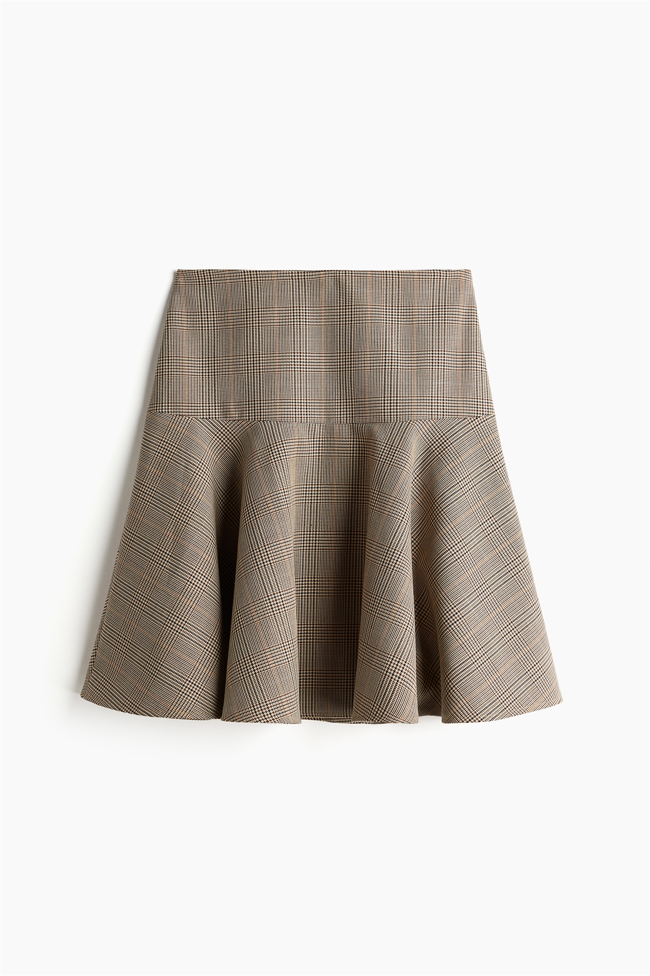 Юбка длиной до колена из тканого материала со стандартной талией, скрытой эластичной резинкой, потайной застежкой на молнию и пуговицу с одной стороны и формирующими вытачками сзади. Шов ниже бедер и расклешение к подолу, который ниспадает мягкими складками, создавая лестный А-образный силуэт. На подкладке.