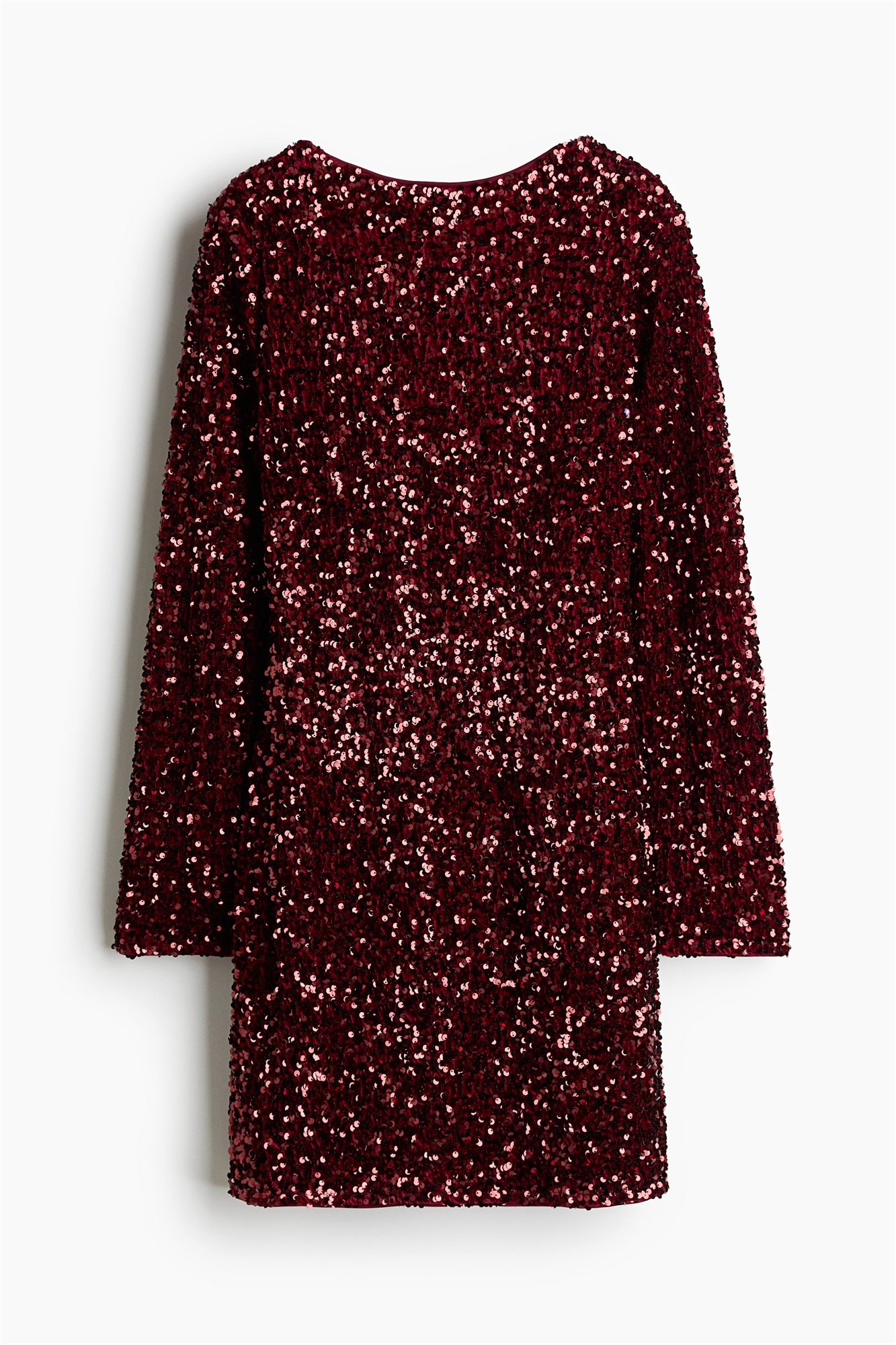 Короткое приталенное платье из блестящего велюра с вырезом-лодочкой спереди и глубоким круглым вырезом сзади. Слегка спущенные плечи и длинные рукава. На подкладке.