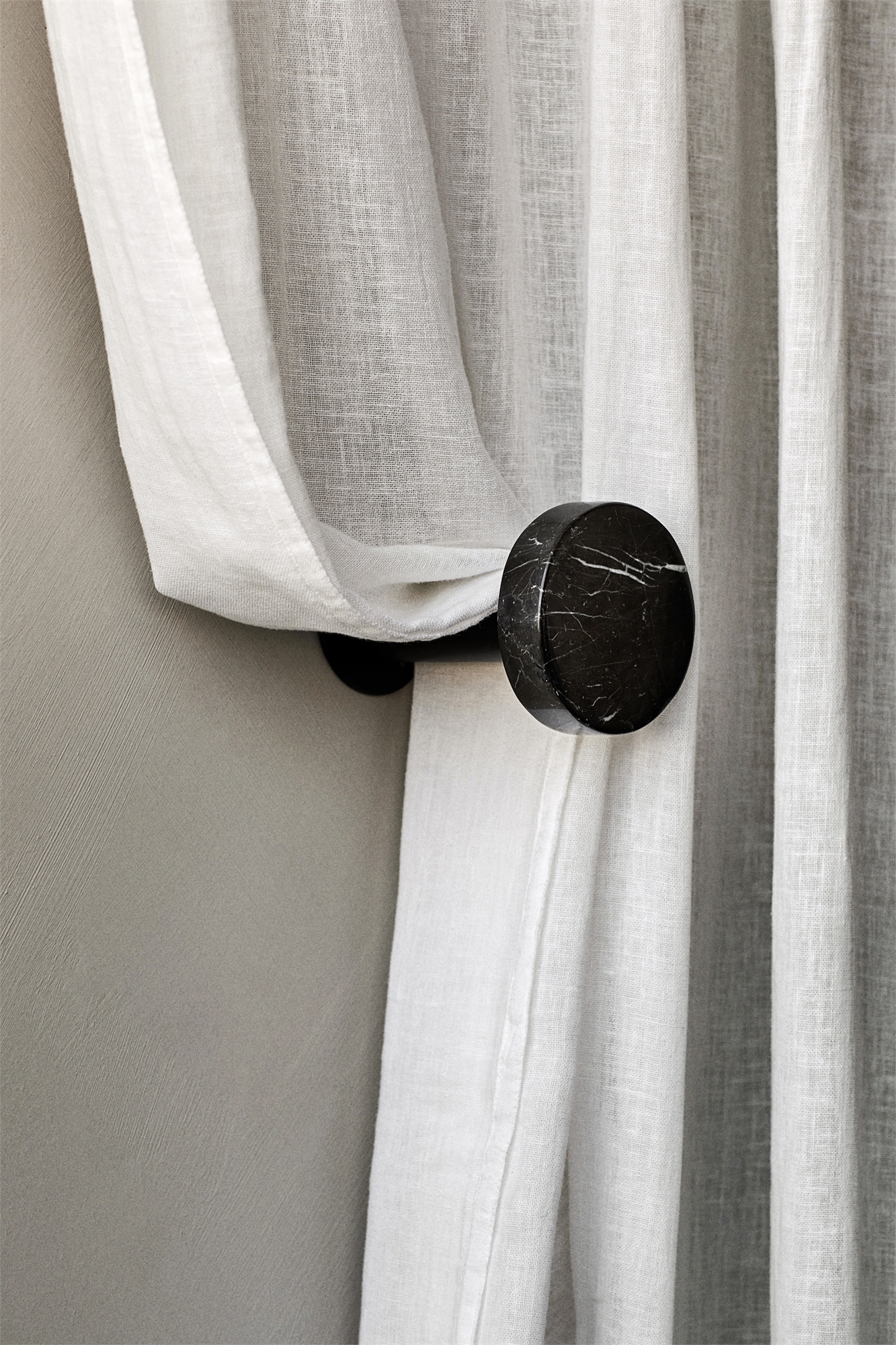 Подхват для штор из мрамора и металла. Диаметр 8 см. Общая длина 12,5 см. Поскольку мрамор является натуральным материалом, цвет каждого изделия может отличаться.