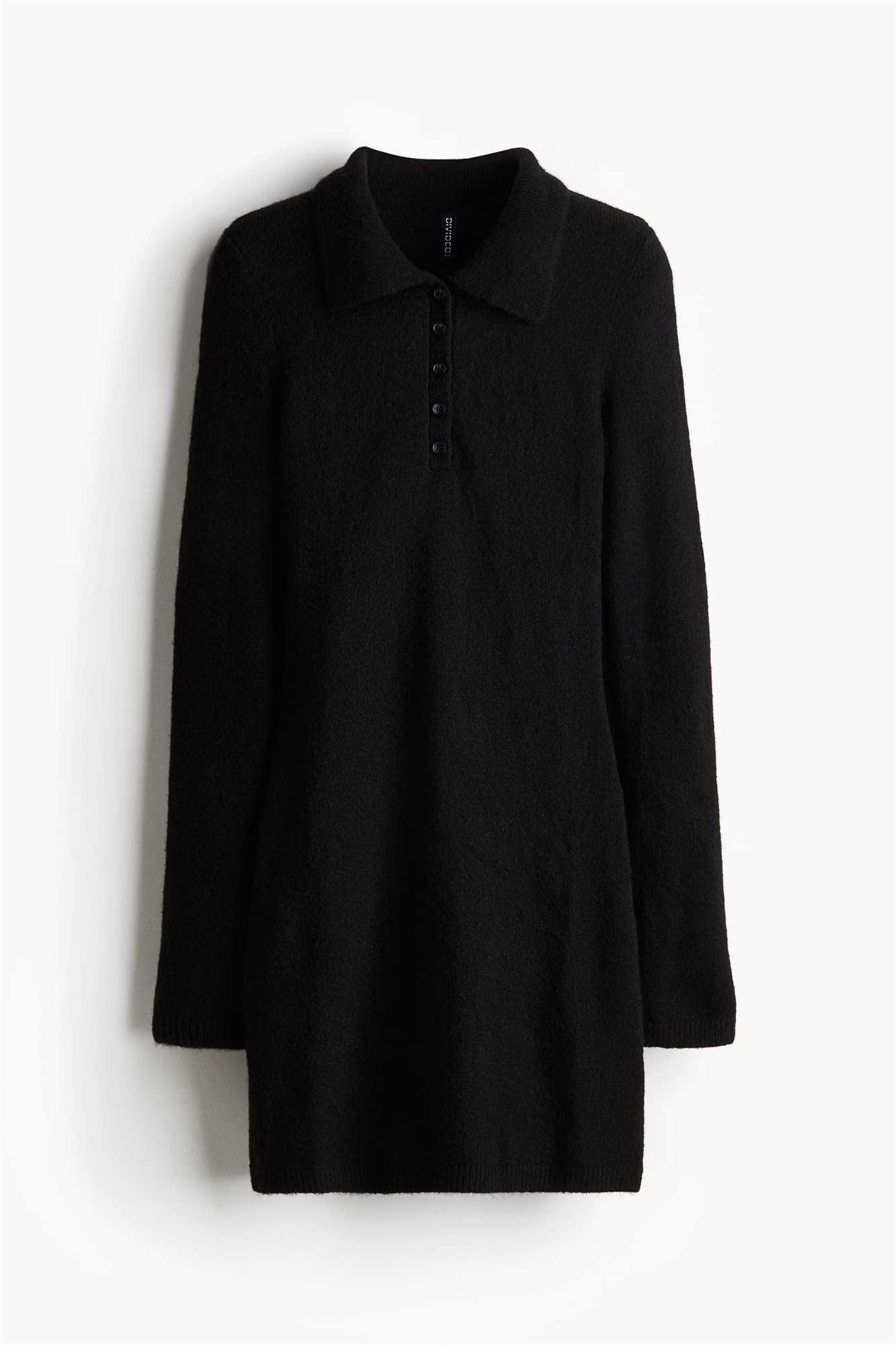 Короткое приталенное платье из мягкого тонкого трикотажа с воротником, застежкой на пуговицы и длинными рукавами. Ребра на манжетах и подоле.