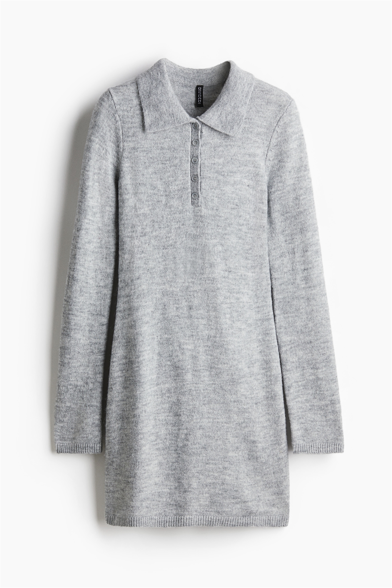 Короткое приталенное платье из мягкого тонкого трикотажа с воротником, застежкой на пуговицы и длинными рукавами. Ребра на манжетах и подоле.
