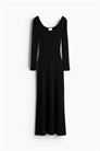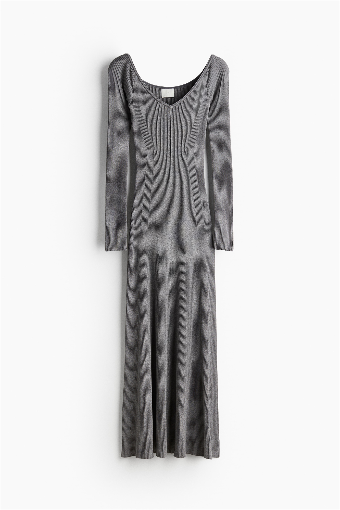 Приталенное платье без плеч длиной до колен из трикотажа в рубчик. V-образный разрез в верхней части и скрытая силиконовая отделка для фиксации платья на месте. Длинные рукава, цельнокроеные разрезы спереди и слегка расклешенная юбка.