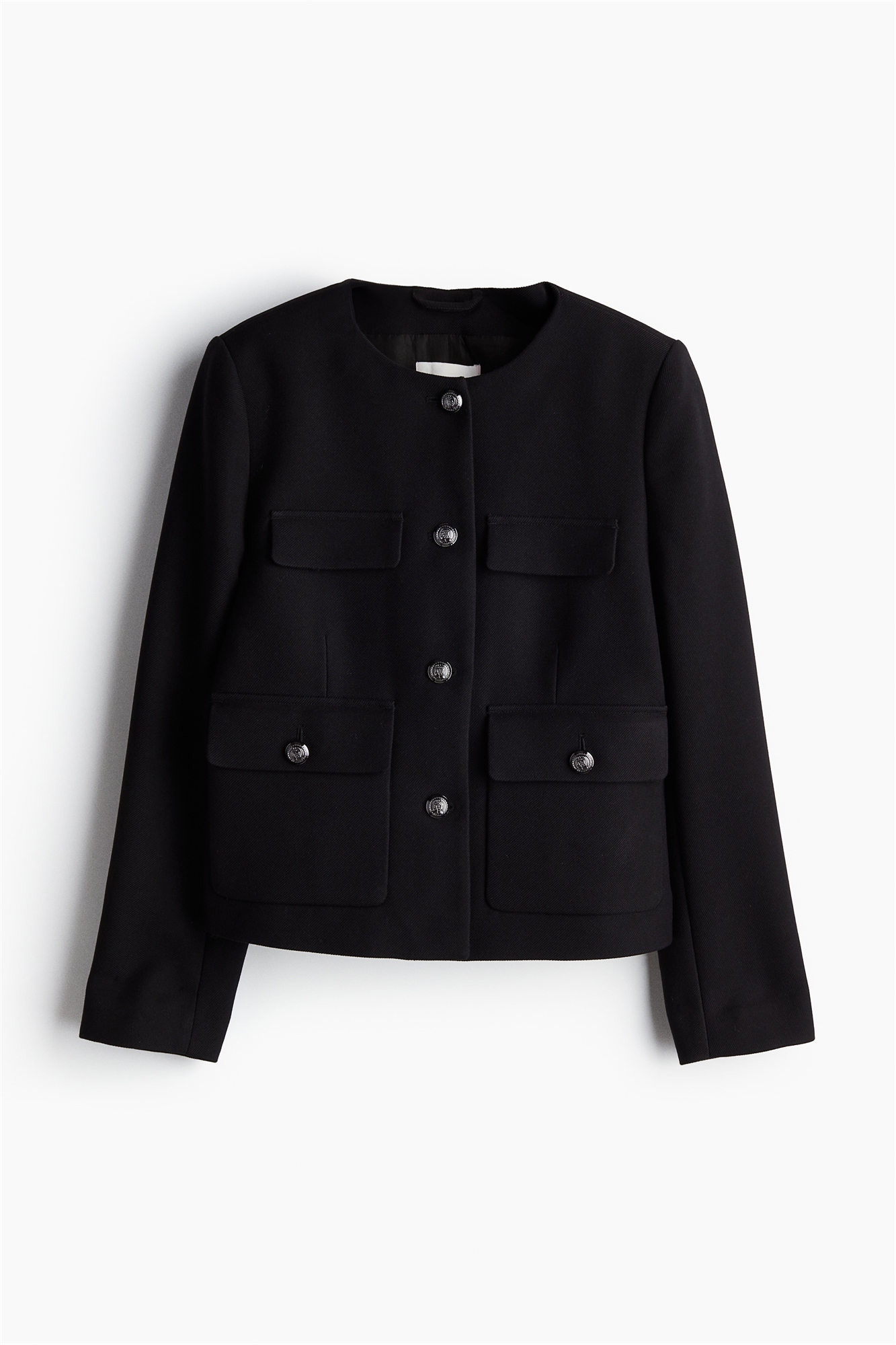 Короткий жакет из тканого материала с круглым вырезом и металлическими пуговицами спереди. Накладки на плечах и длинные рукава с разрезом на манжетах. Декоративные карманы на груди и накладные передние карманы на пуговице. Фигурные вытачки спереди и сзади для придания силуэту стройности. На подкладке.