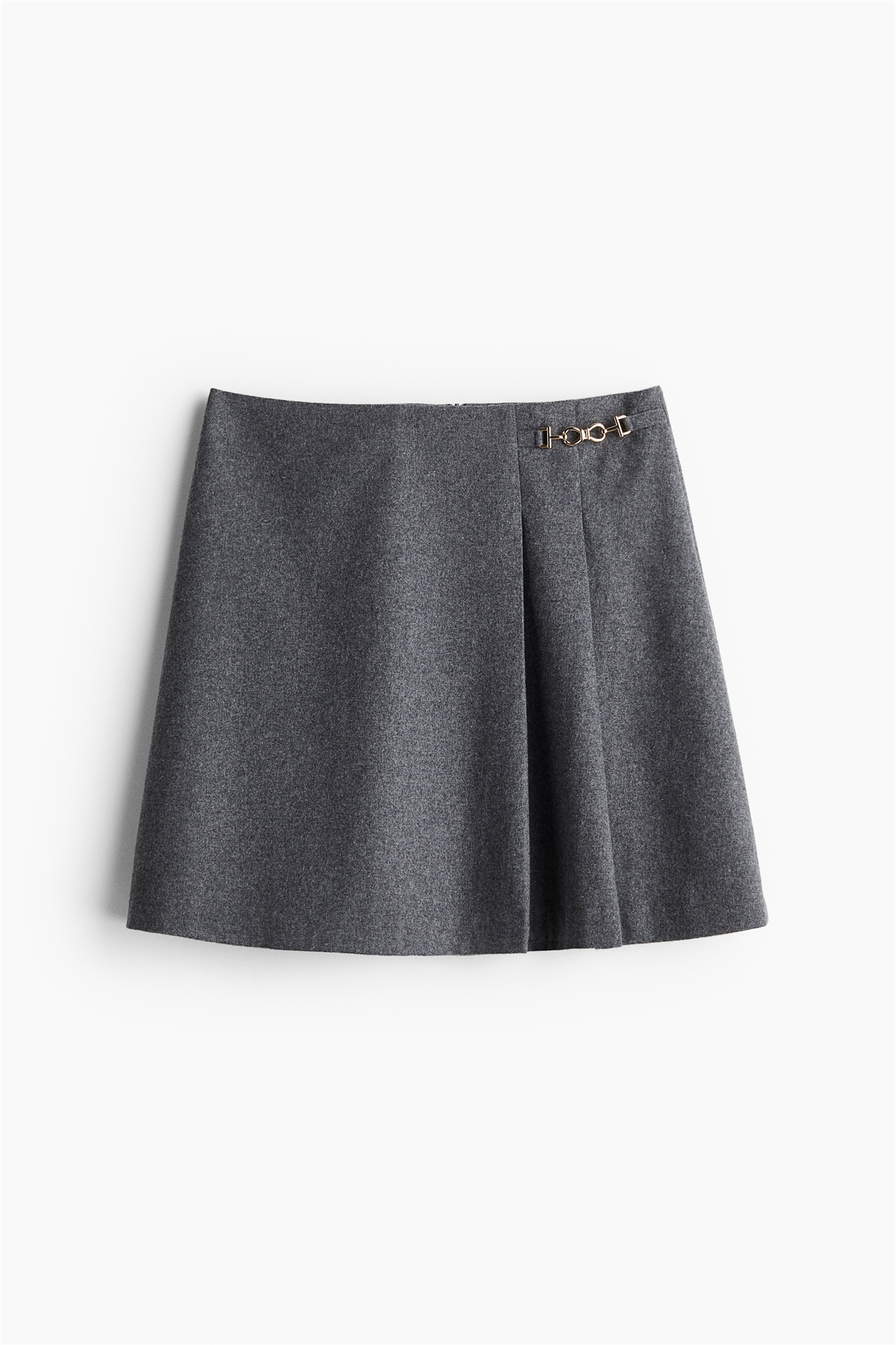 Короткая юбка А-линии из тканого материала с высокой талией и потайной застежкой на молнию и пуговицу сзади. Складки и декоративная металлическая деталь с одной стороны спереди. На подкладке.