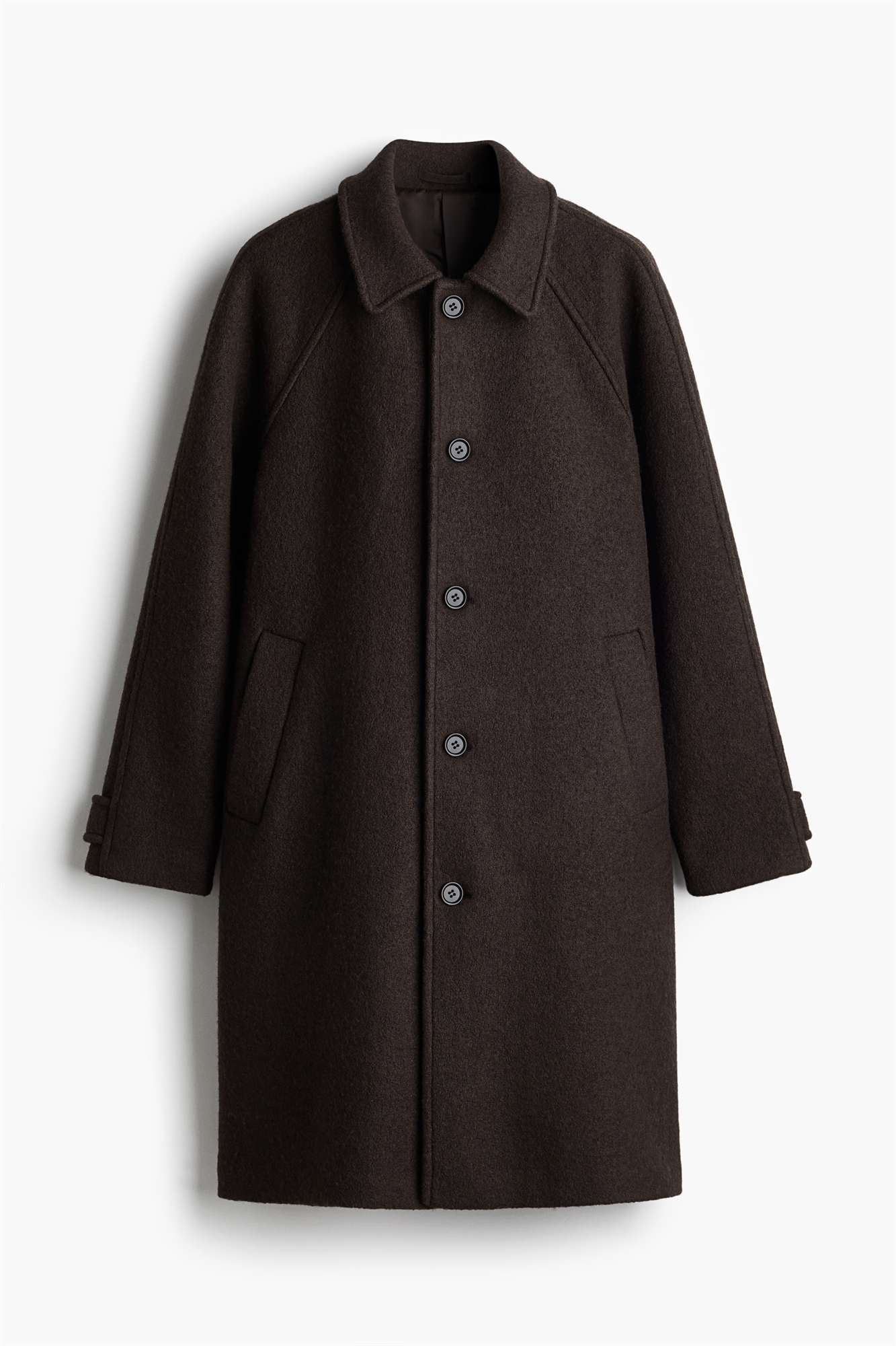 Автомобильное пальто из шерстяного микса с воротником, пуговицами спереди, диагональными карманами по бокам и двумя внутренними карманами. Длинные рукава реглан с манжетами на пуговицах. Одиночная вентиляция сзади. Регулярный крой для комфортной носки и классического силуэта. На подкладке.