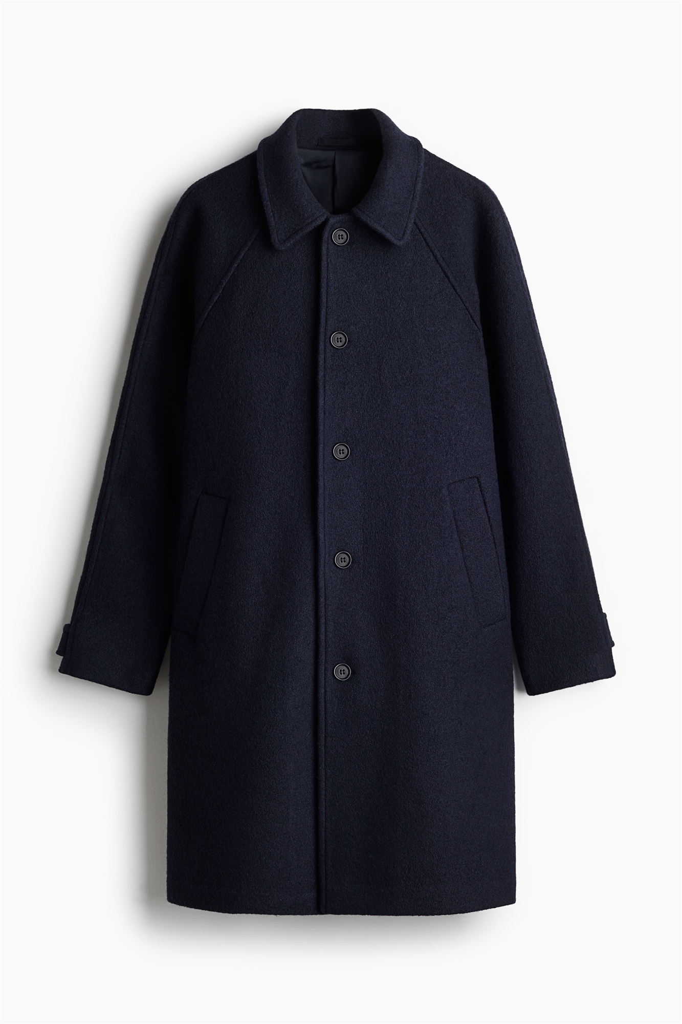 Автомобильное пальто из шерстяного микса с воротником, пуговицами спереди, диагональными карманами по бокам и двумя внутренними карманами. Длинные рукава реглан с манжетами на пуговицах. Одиночная вентиляция сзади. Регулярный крой для комфортной носки и классического силуэта. На подкладке.