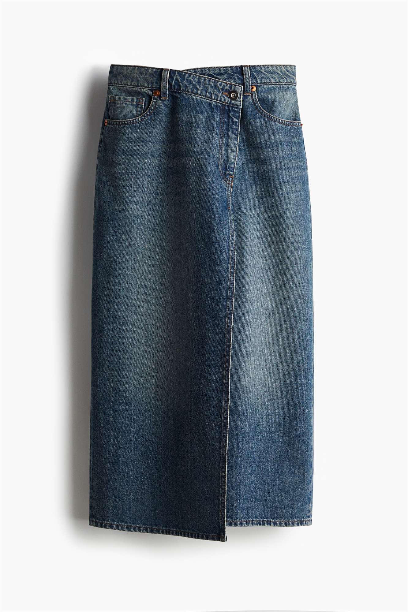 Длинная юбка с 5 карманами из плотного хлопкового денима с поясом на талии и застежкой на молнию с одной видимой и одной потайной пуговицей.