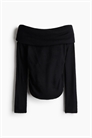 Короткий, приталенный джемпер без плеч из гладкого трикотажа с широким отложным краем и длинными рукавами. Эластичные боковые швы создают эффект легкой драпировки. Узкая тесьма на манжетах и подоле.