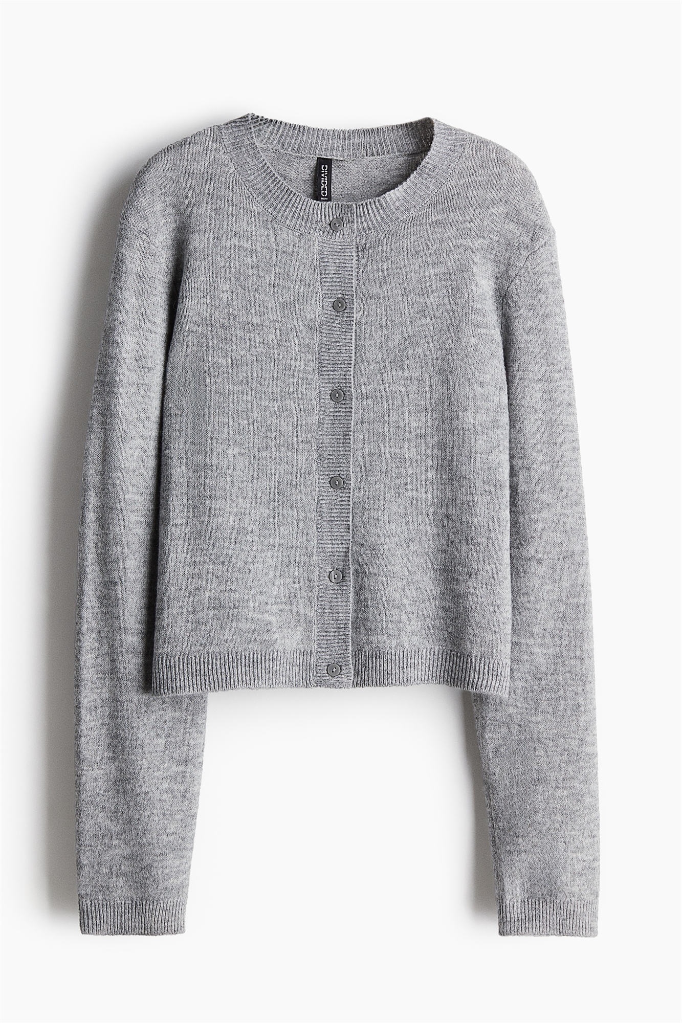 Короткий приталенный кардиган из мягкого тонкого трикотажа с добавлением шерсти. Круглый вырез с ребристой отделкой, пуговицы спереди и длинные рукава. Окантовка пуговиц, манжеты и подол.