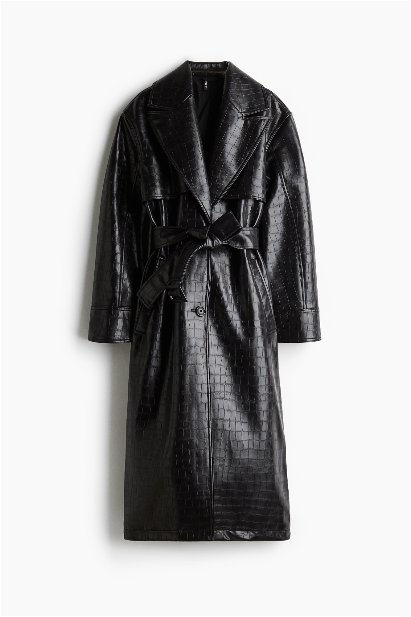 Однобортный тренч из ткани с покрытием, с воротником, лацканами с вырезом и пуговицами спереди. Свободный крой с опущенными плечами и длинными рукавами с манжетами. Накладные карманы спереди, съемный пояс на талии и один задний клапан. На подкладке.