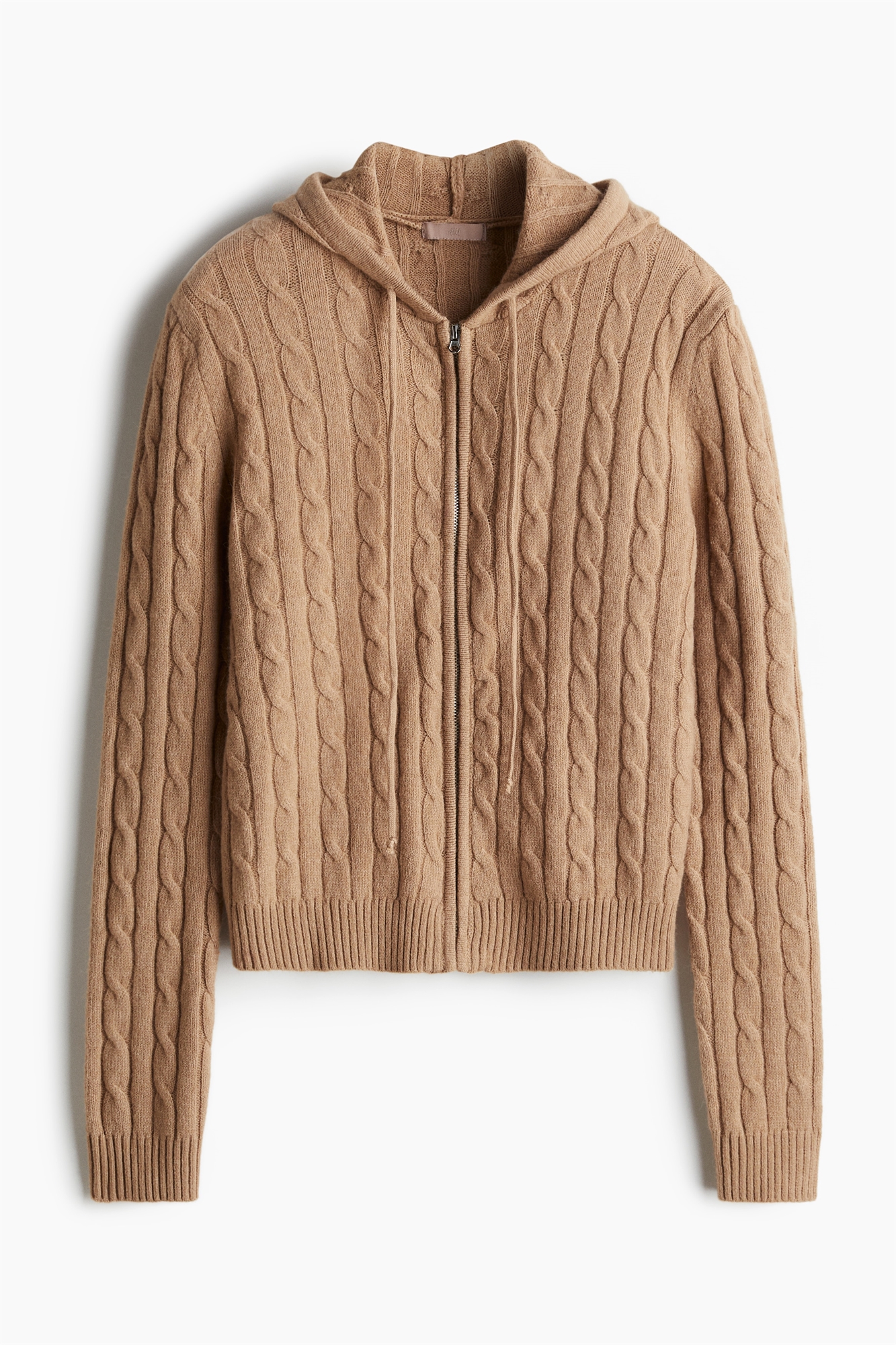 Топ из мягкого кабельного трикотажа с капюшоном на завязках, потайной застежкой-молнией спереди и длинными рукавами. Манжеты и подол отделаны ребрами жесткости.