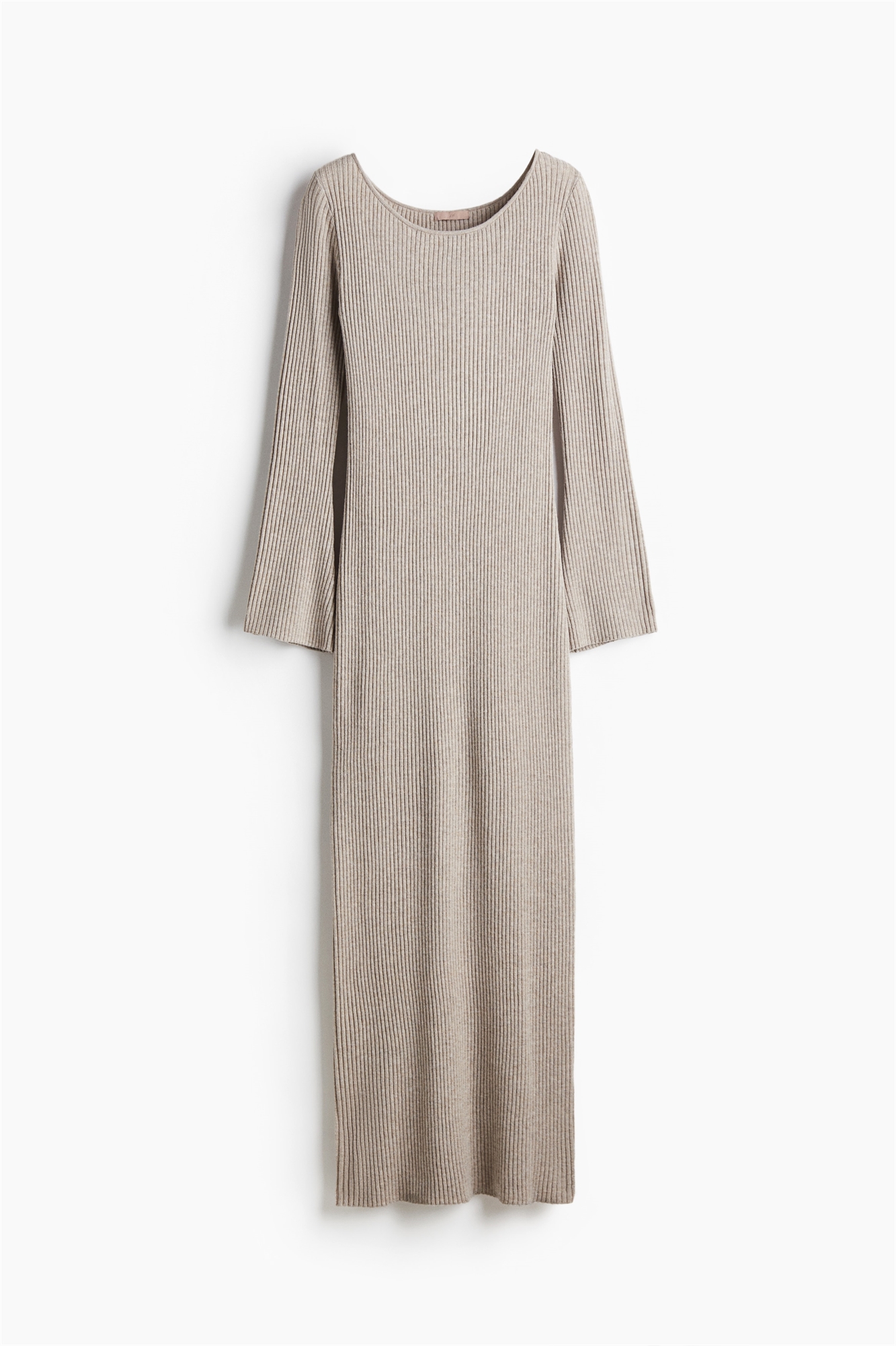 Приталенное платье длиной до щиколоток из мягкого ребристого трикотажа с У-образным вырезом и длинными, слегка расклешенными рукавами.
