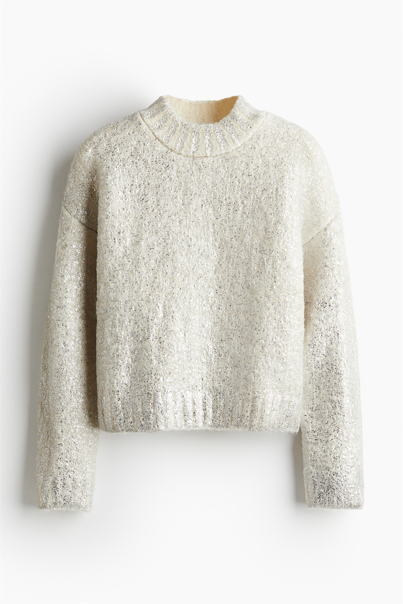 Джемпер из фактурного трикотажа с круглым вырезом в рубчик. Свободный крой с опущенными плечами, длинными рукавами и окантовкой манжет и подола.
