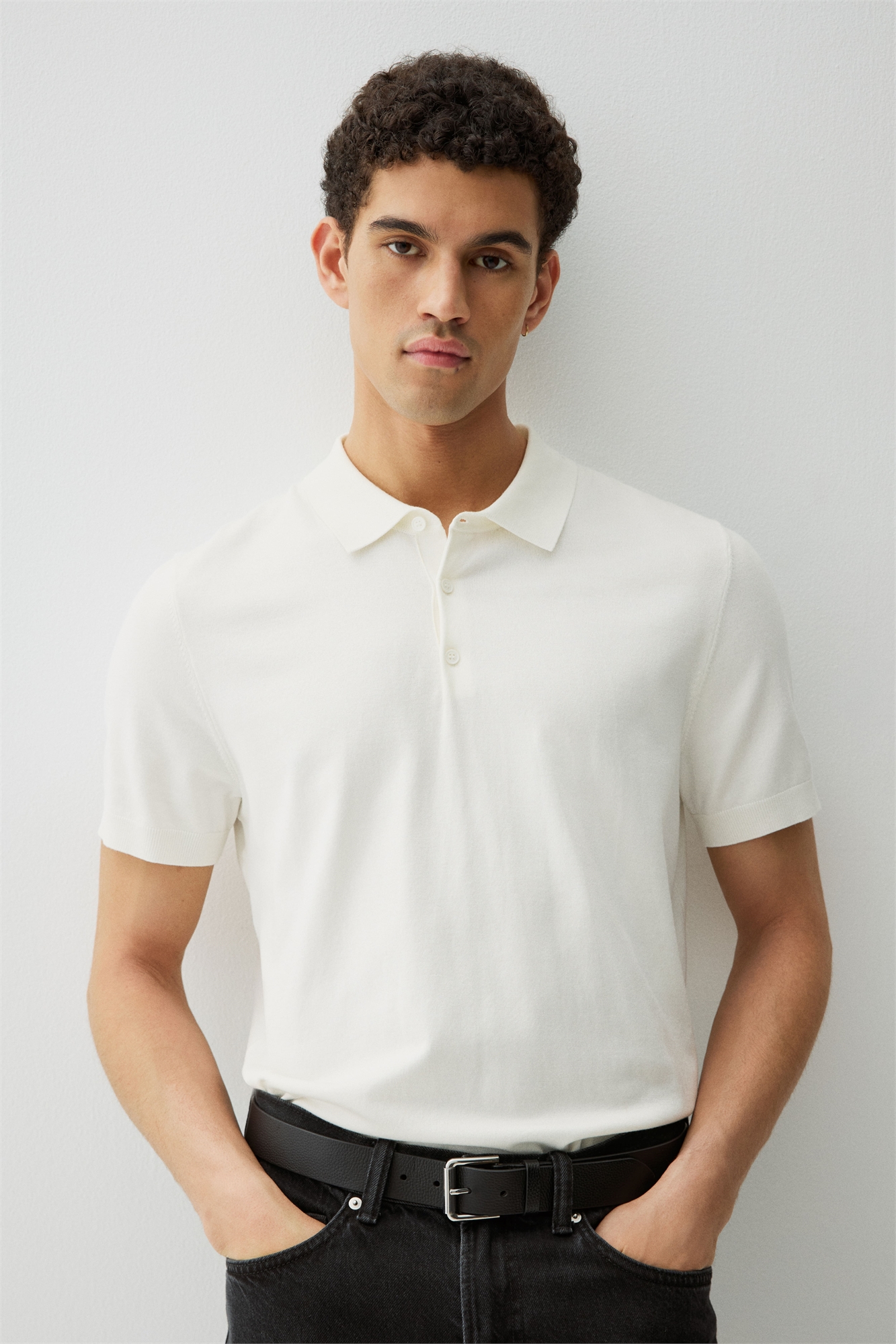 Рубашка-поло из мягкого тонкого трикотажа с воротником, застежкой на пуговицы, короткими рукавами и прямым подолом. Зауженный крой, облегающий контуры тела и создающий приталенный силуэт.