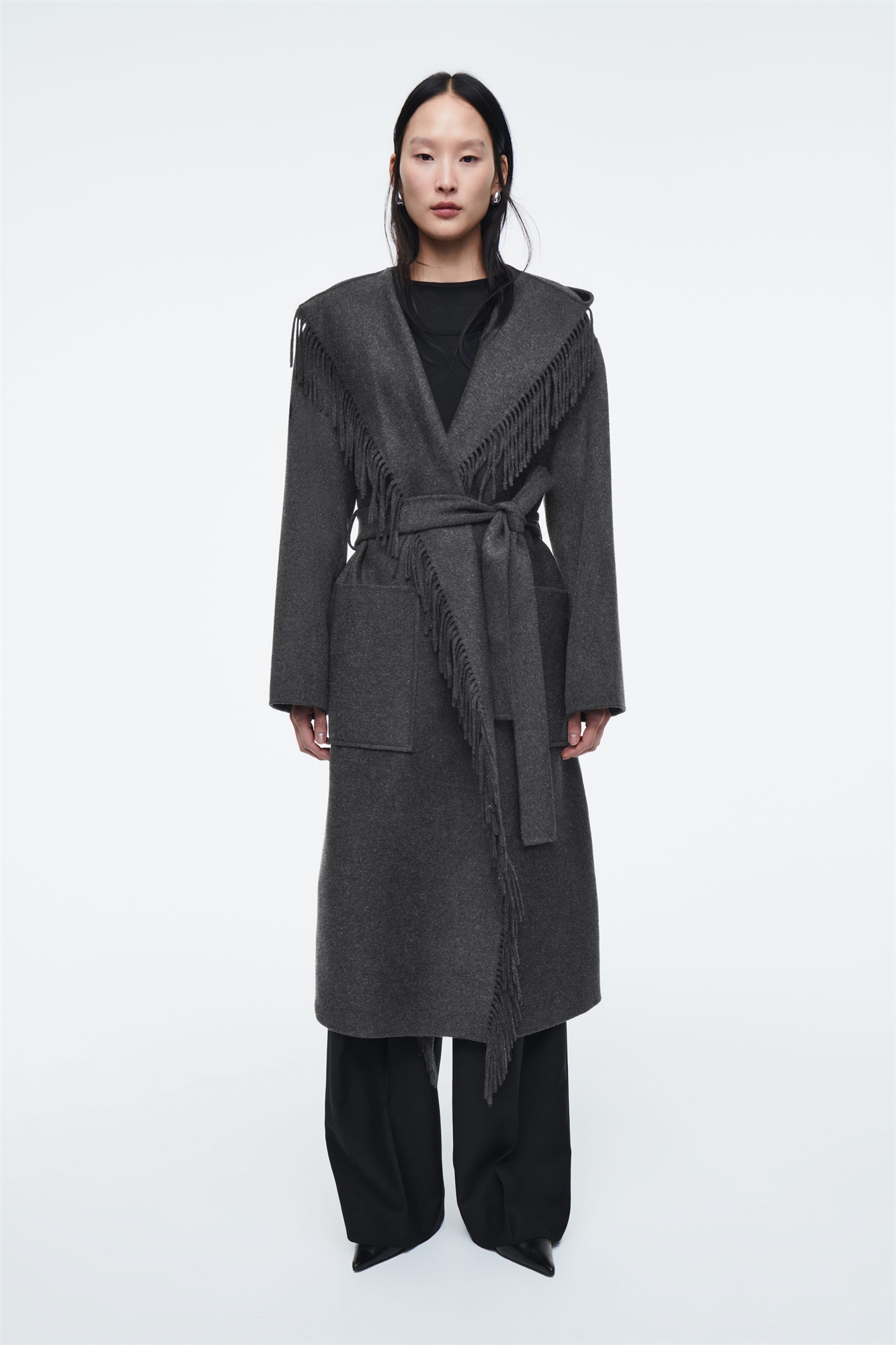 Это антрацитово-серое пальто из двухслойной шерстяной смеси украшено деталями в стиле вестерн, в том числе бахромой спереди. В остальном оно имеет свободный крой, что позволяет носить его поверх толстого трикотажа. Широкий капюшон и съемный пояс на талии завершают дизайн. Свободный крой Прикрепленные карманы спереди, разрез сзади Эта вещь сертифицирована в соответствии со стандартом ответственной шерсти TE-00047206 (RWS) и содержит шерстяные волокна с ферм, сертифицированных в соответствии с правилами благополучия животных и сельскохозяйственными нормами Внешний материал: 60% шерсть RWS, 40% TENCEL™ Lyocell. Детали исключены/Сухая чистка Длина по спинке в размере S = 119,5 см/Модель носит размер S