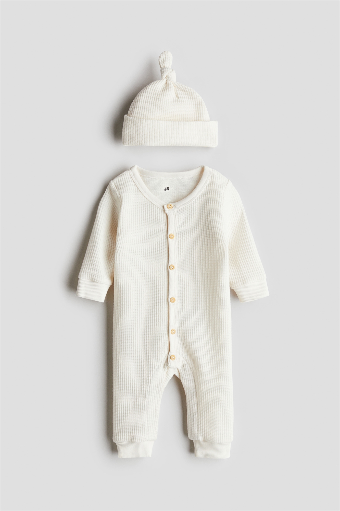 Комплект из комбинезона-ромпера и бини из вафельного хлопкового джерси. Ромпер с длинными рукавами, круглым вырезом, пуговицами под дерево спереди и тесемками на манжетах и по краям. Застежки на кнопках вдоль ног для удобства переодевания. Шапочка с узелком на макушке и отворотом на подоле.