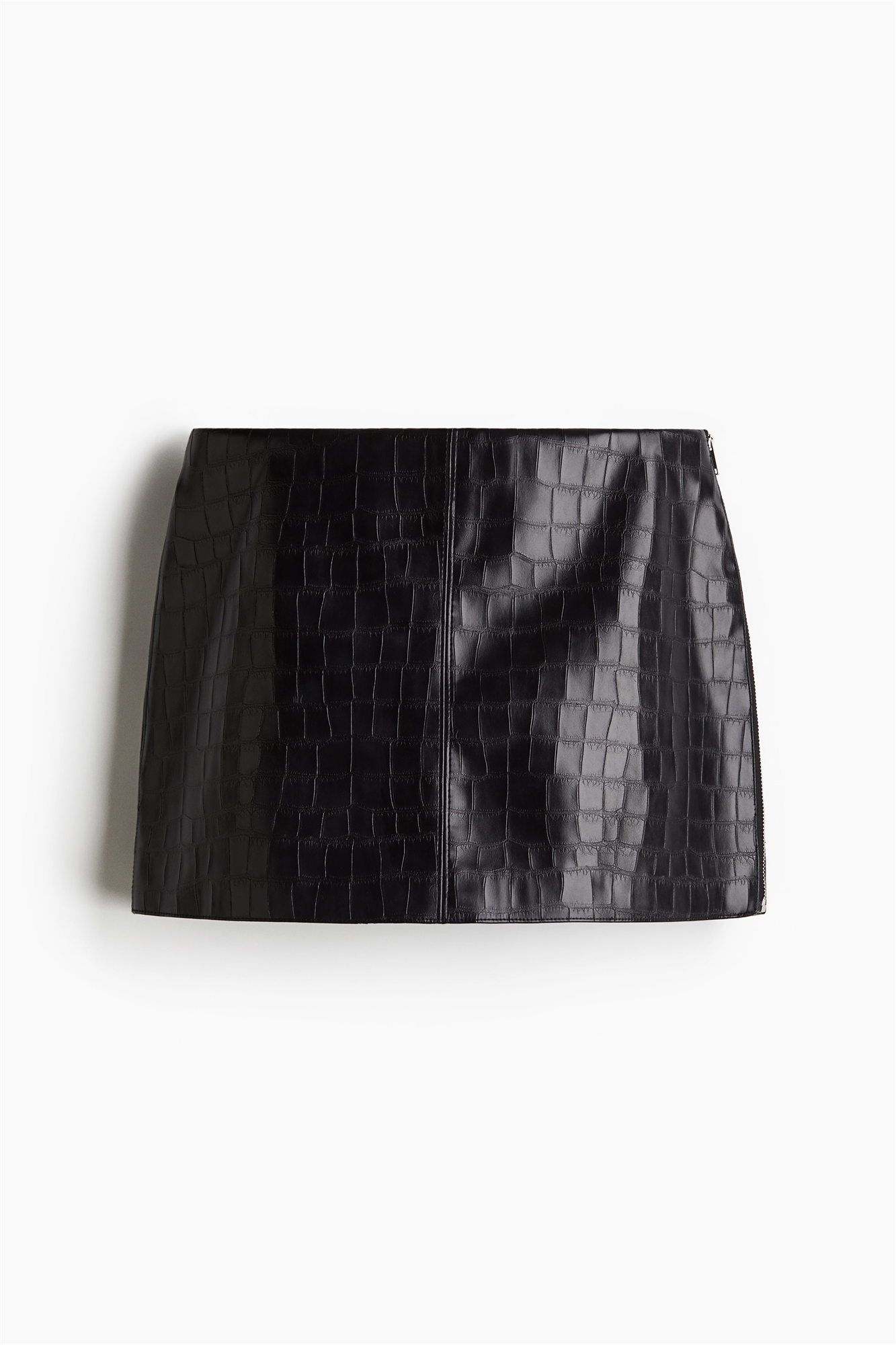 Мини-юбка из ткани с покрытием и крокодиловым узором. Видимая застежка-молния и потайная закладка и пуговица с одной стороны. На подкладке.