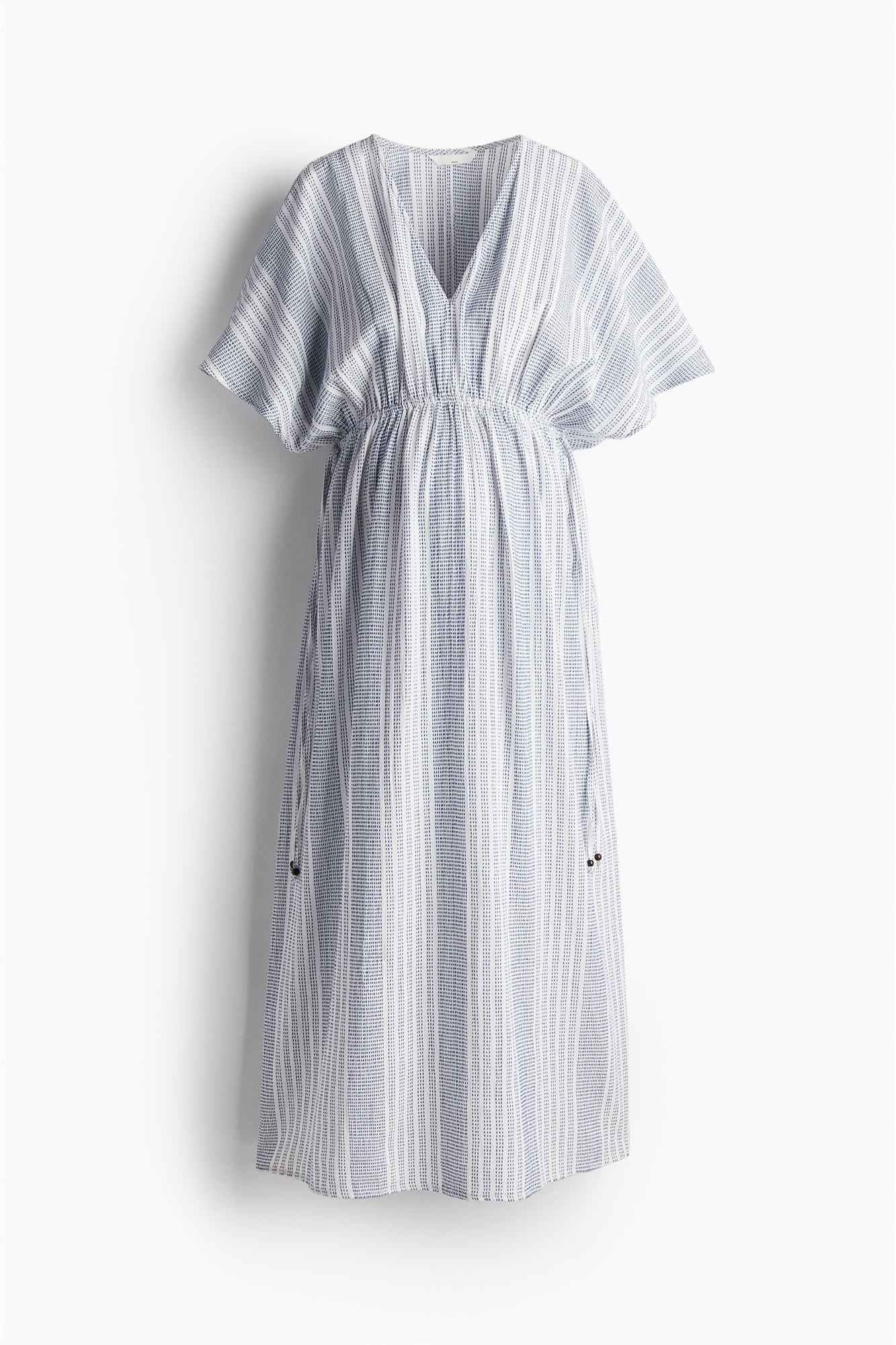 Платье длиной до щиколоток из хлопкового карего полотна с V-образным вырезом, короткими рукавами, эластичной подкладкой под бюстом и декоративными завязками по бокам. Без подкладки.