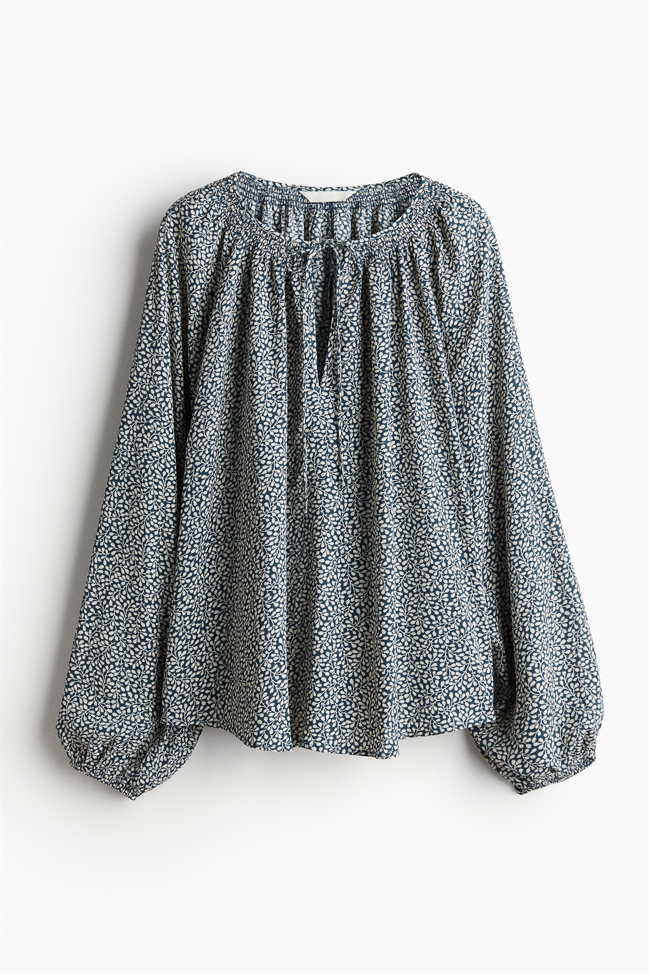 Блузка оверсайз из крепа с круглым вырезом с V-образной проймой и завязками-спагетти спереди. Длинные рукава реглан с эластичными манжетами. Аккуратный закругленный подол.