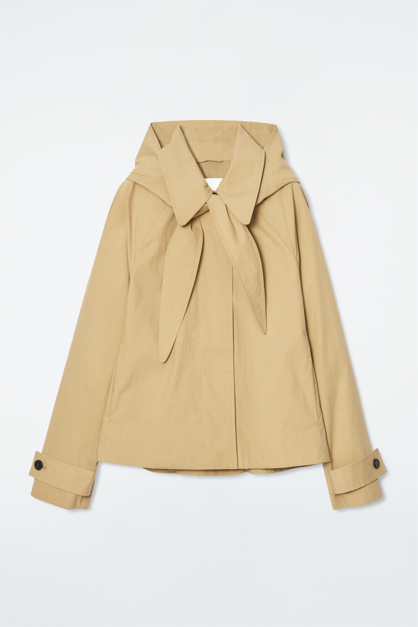 Вдохновленный дизайном из архивов COS, этот укороченный тренч имеет классический вид, но при этом осовременен изысканными акцентами. Он выполнен из смеси хлопка в нестареющем бежевом цвете и имеет модный капюшон, который завязывается спереди как шарф и может быть снят в солнечные дни. Глубокая складка сзади придает фасону дополнительный объем. Регулярный крой Рубашка на пуговицах Благодаря использованию переработанного нейлона мы сокращаем потребность в ограниченных природных ресурсах и уменьшаем выбросы парниковых газов Внешняя ткань: 80 % хлопка, 20 % переработанного полиамида (переработанный нейлон). Подкладка: 100% органический хлопок. Детали исключены/Машинная стирка Длина по спинке в размере ЕС 36 = 62,5 см/Модель носит размер ЕС 36