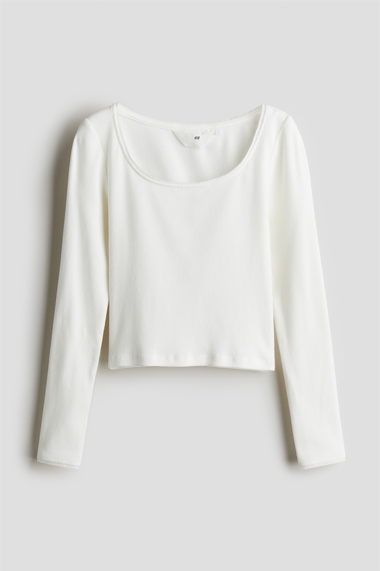 Топ из ребристого хлопкового джерси с глубоким круглым вырезом и отделкой пико. Длинные рукава и прямой подол.