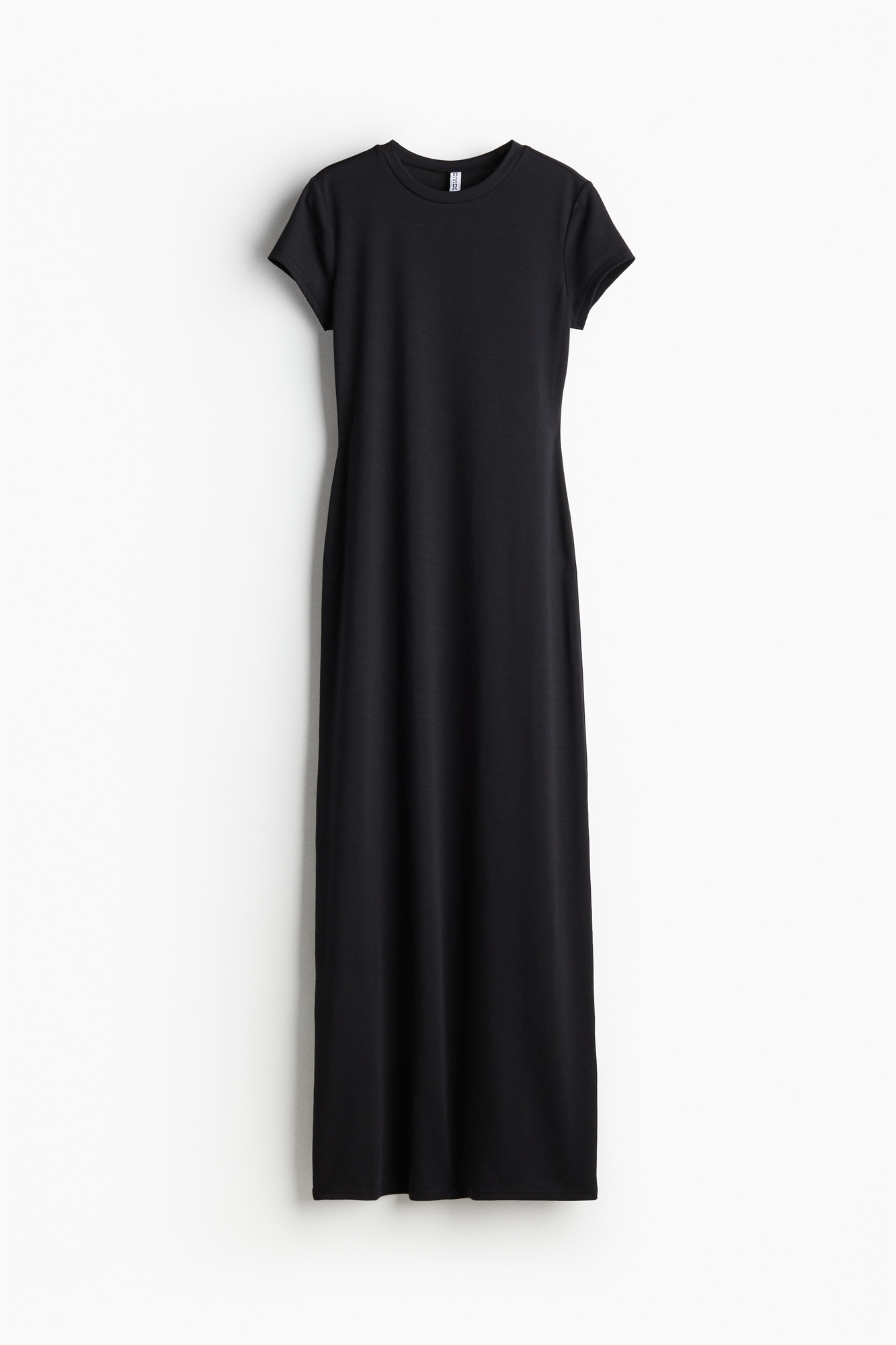 Длинное приталенное платье из мягкого джерси с круглым вырезом с узкой окантовкой, короткими рукавами и прямым покроем.