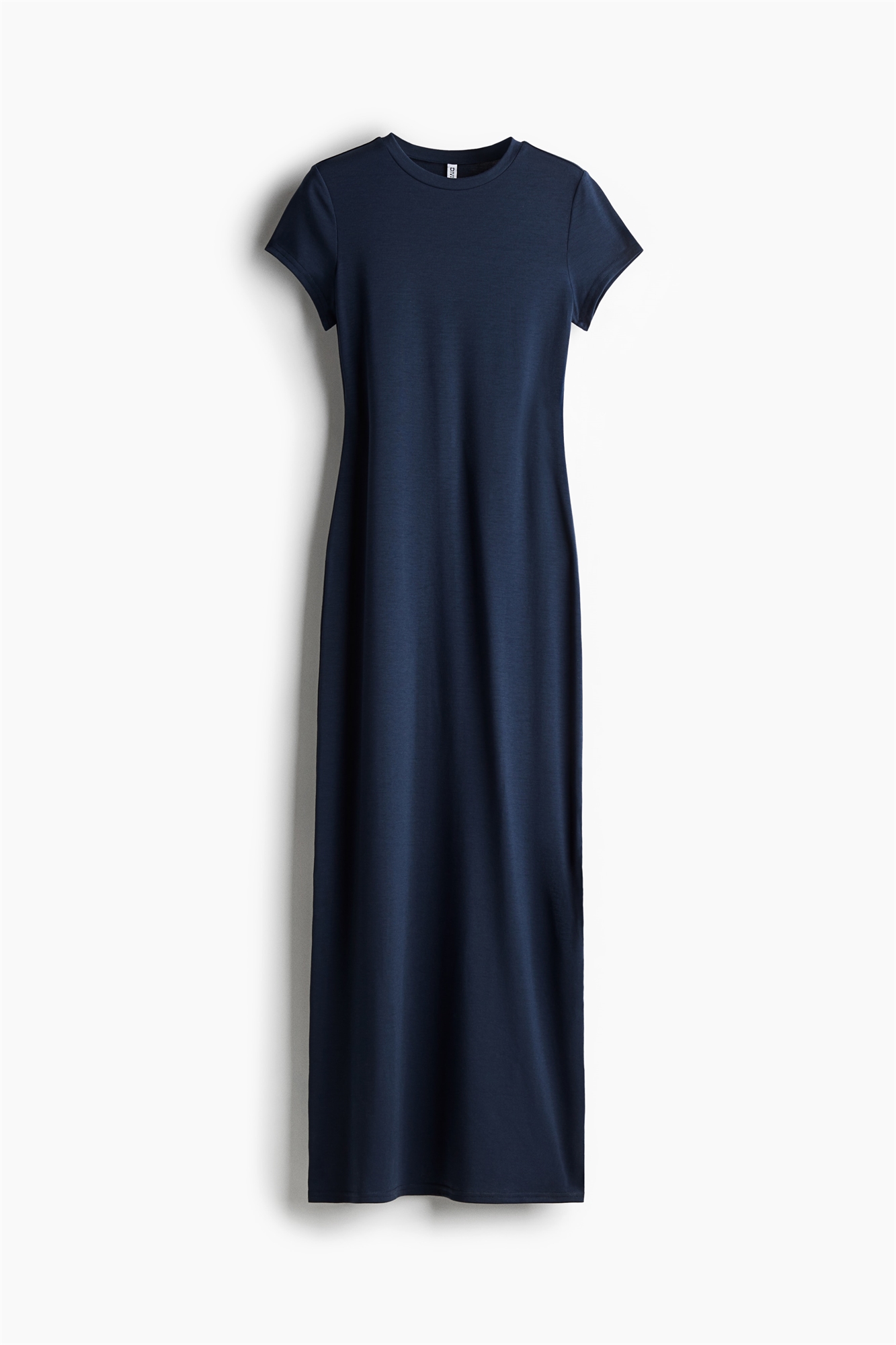Длинное приталенное платье из мягкого джерси с круглым вырезом с узкой окантовкой, короткими рукавами и прямым покроем.