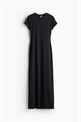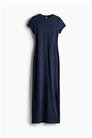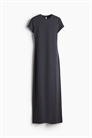 Длинное приталенное платье из мягкого джерси с круглым вырезом с узкой окантовкой, короткими рукавами и прямым покроем.