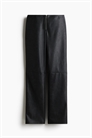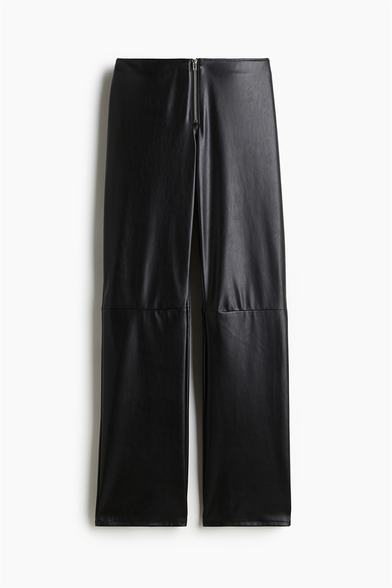 Облегающие брюки из ткани с покрытием, застежка на молнию и потайную пуговицу. Видимый шов под коленями и расклешенные подолы.