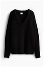 Джемпер свободного кроя из мягкого, пушистого трикотажа с содержанием мохера и шерсти. V-образный вырез, спущенные плечи и длинные рукава с облегающими манжетами.