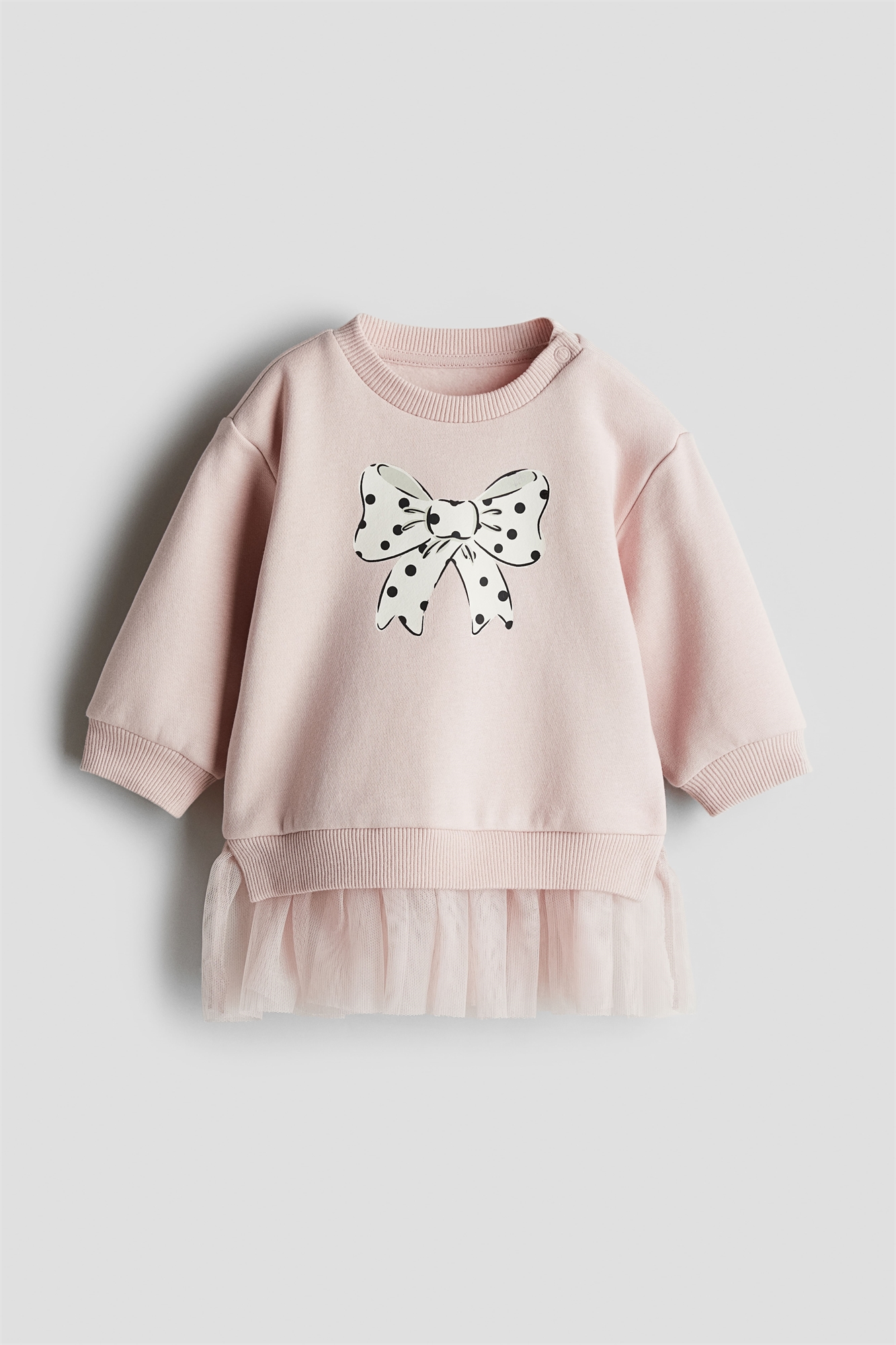 Платье с длинными рукавами из принтованной толстовки с мягким начесом внутри и юбкой из тюля. Круглый вырез с ребристой отделкой и застежкой на одном плече (кроме размеров 2-4Y). Ребристые манжеты и подол.