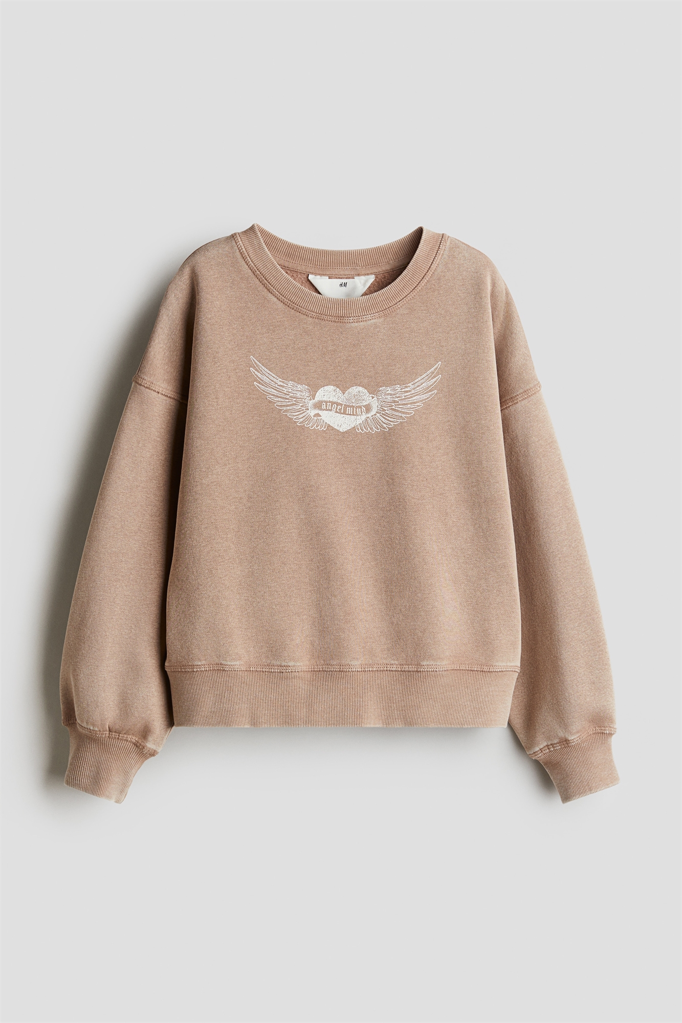 Топ оверсайз из толстовочной ткани с мягкой начесом внутри и мотивом спереди. Круглый вырез в рубчик, спущенные плечи, длинные рукава, манжеты и подол в рубчик.