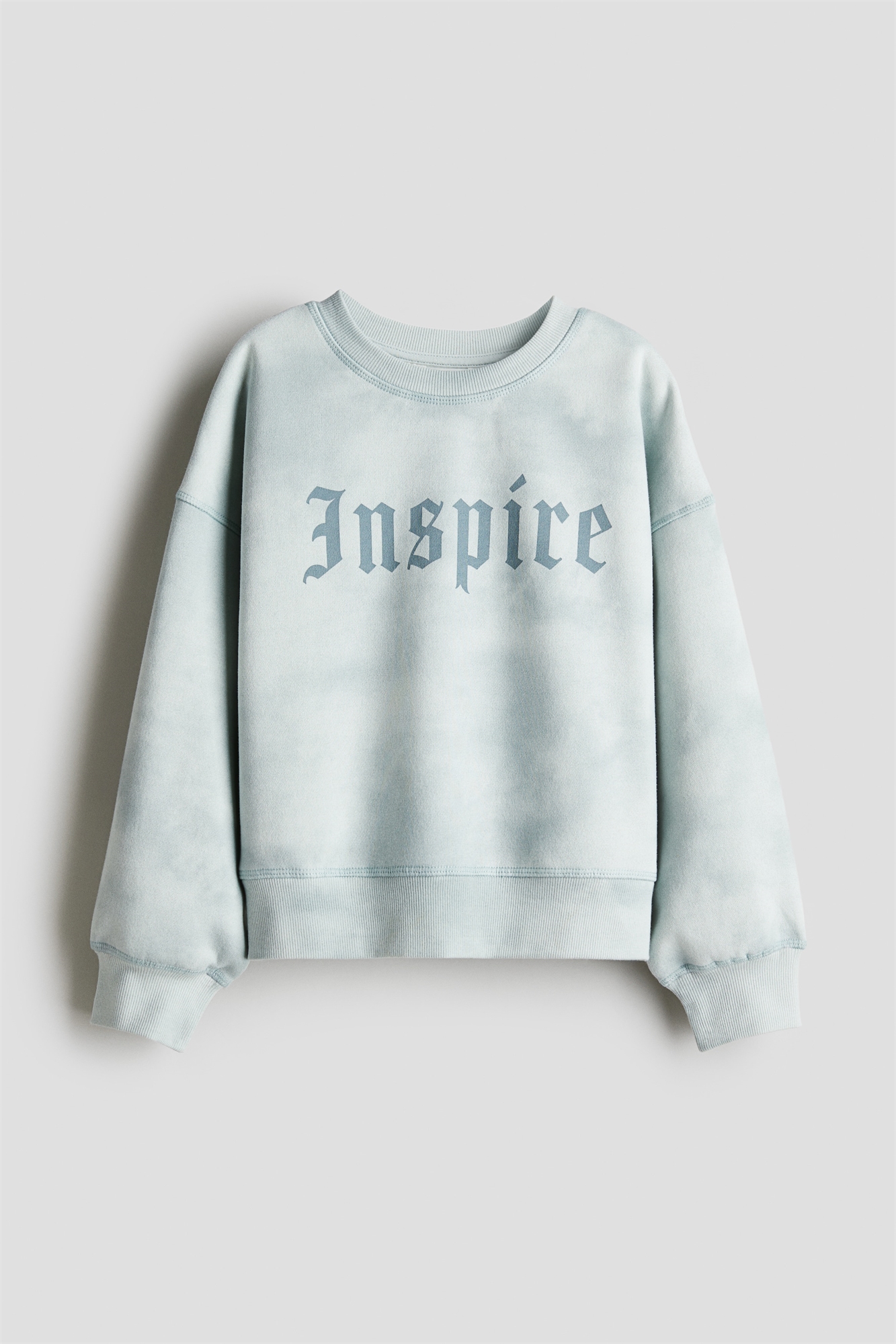 Топ оверсайз из толстовочной ткани с мягкой начесом внутри и мотивом спереди. Круглый вырез в рубчик, спущенные плечи, длинные рукава, манжеты и подол в рубчик.