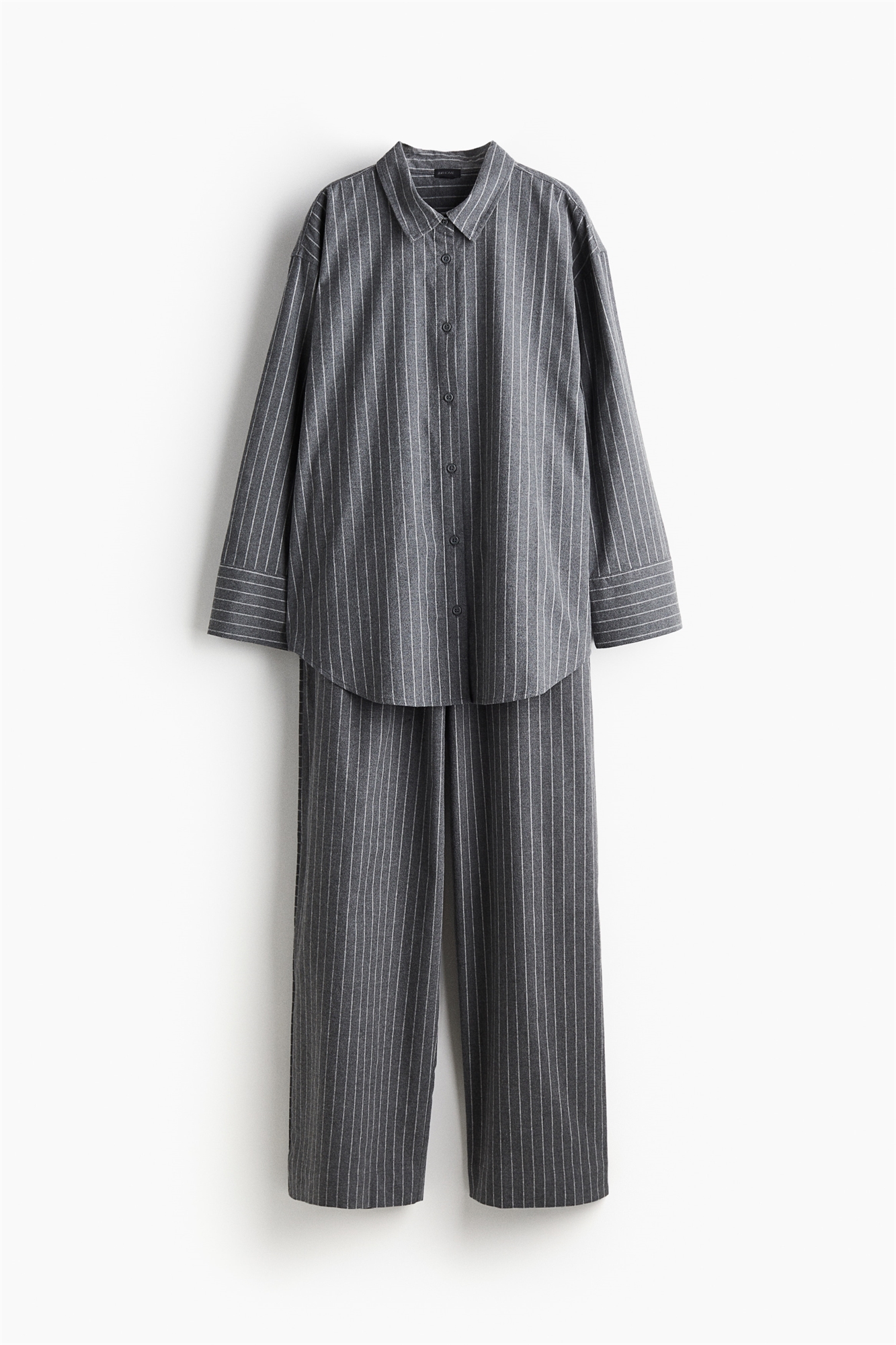 Полосатая пижама с рубашкой и нижней частью из мягкой хлопковой фланели. Рубашка с воротником, застежкой на пуговицы спереди, слегка спущенными плечами и длинными рукавами с широкими манжетами. Нижние штанишки с эластичным утягивающим поясом и боковыми карманами.