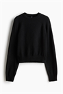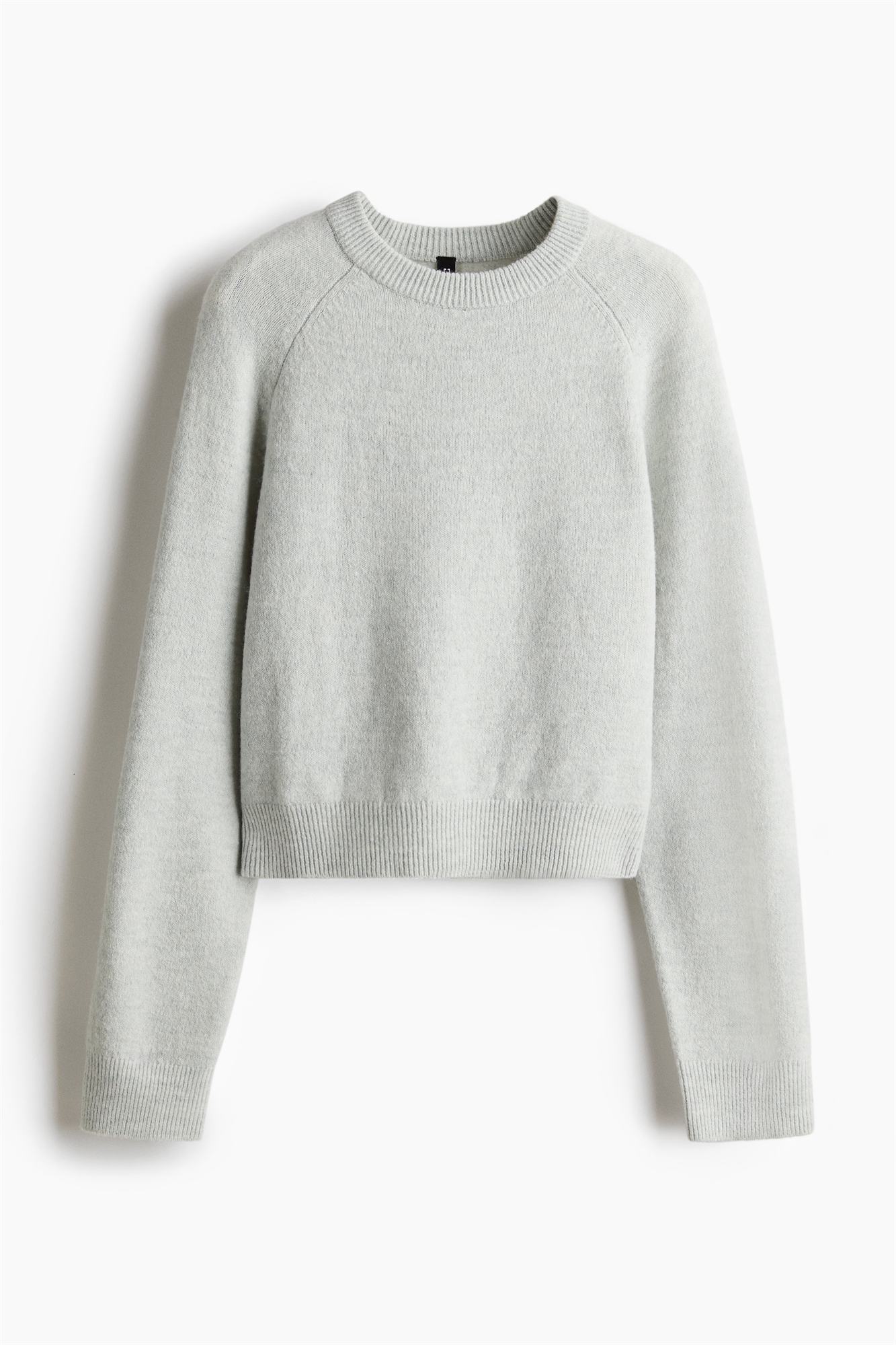 Короткий джемпер из мягкого тонкого трикотажа с добавлением шерсти. Круглый вырез в рубчик, длинные рукава реглан, манжеты и подол в рубчик.