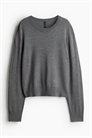 Короткий джемпер из мягкой вискозной ткани тонкой вязки с круглым вырезом, отделанным ребрами, спущенными плечами и длинными рукавами. Ребристые манжеты и подол.