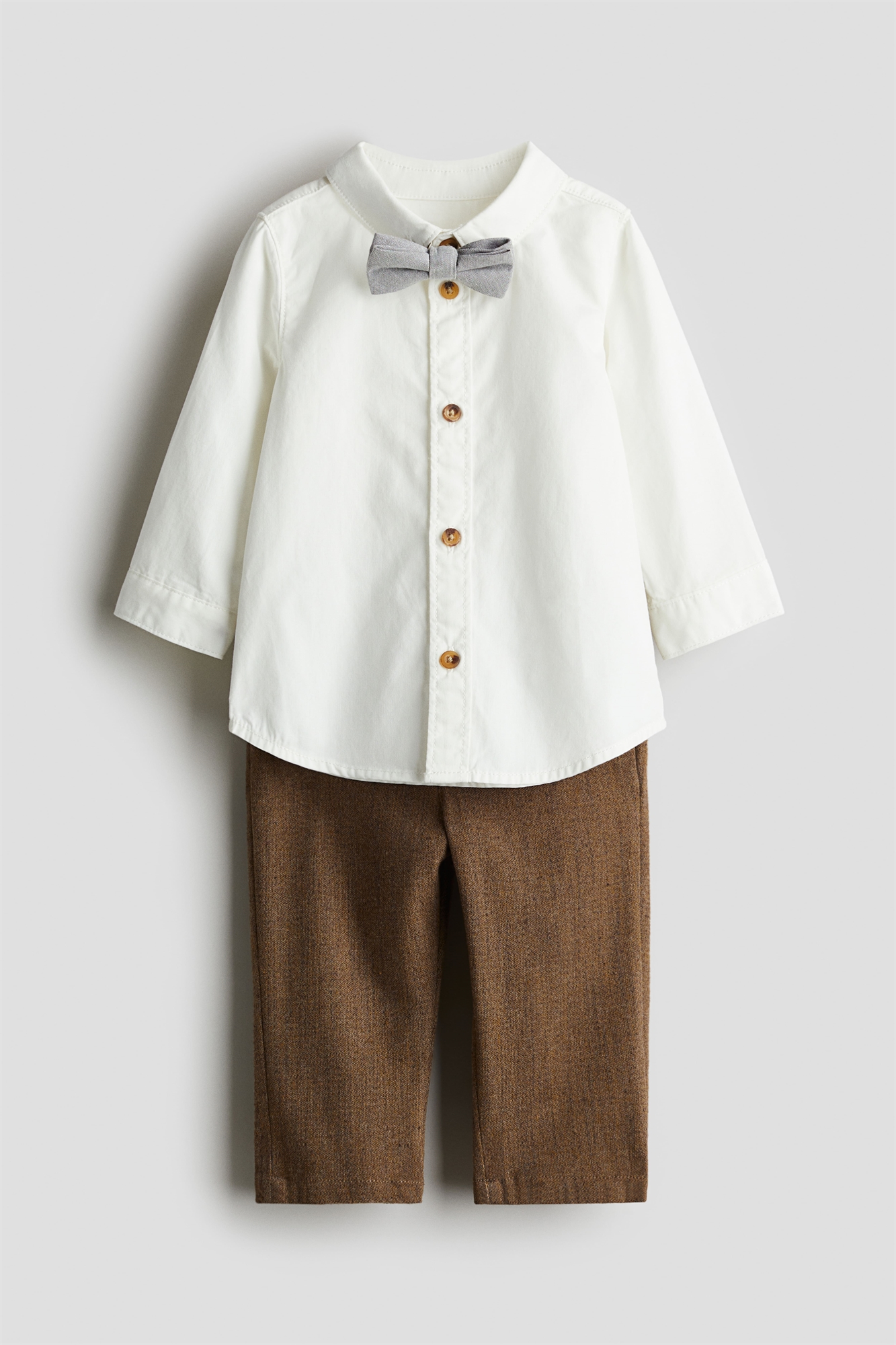 Комплект из рубашки и брюк из тканого материала и галстука-бабочки. Рубашка с отложным воротником и пуговицами спереди и на манжетах. Брюки с регулируемым эластичным поясом, фальшивой ширинкой и пуговицей. Декоративные боковые карманы и зауженные ножки. Галстук-бабочка с регулируемым эластичным ремешком и пластиковой застежкой сзади.