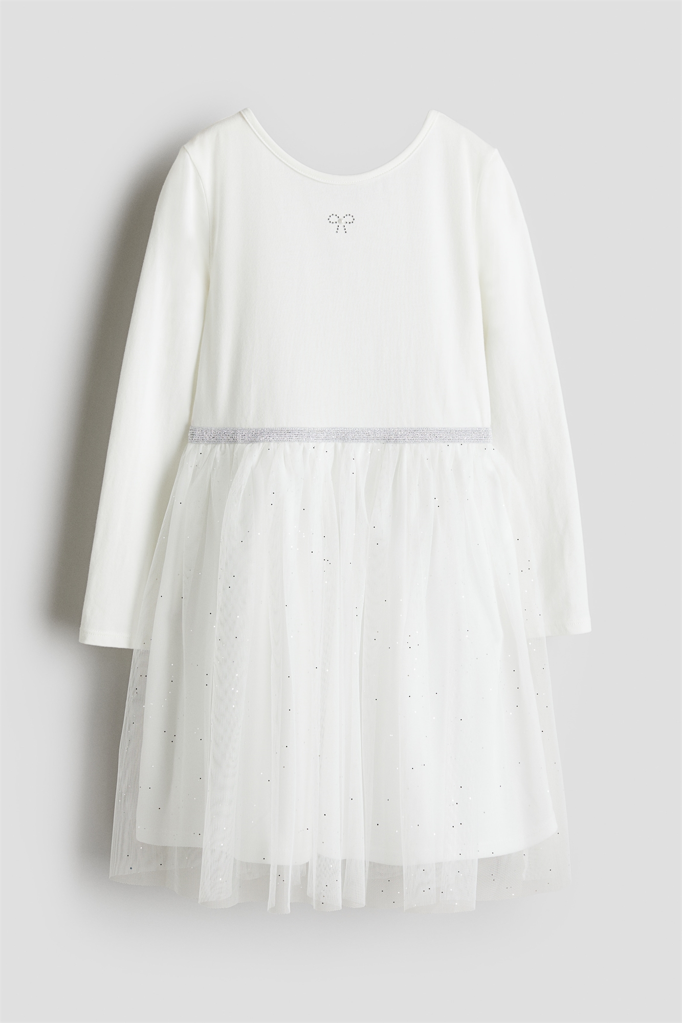 Платье из мягкого хлопкового джерси с юбкой из тюля. Круглый вырез, длинные рукава и эластичная отделка со складками на талии. На подкладке.
