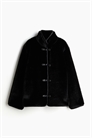 Свободный жакет из мягкой пушистой ткани с отделкой из лакированной ткани по краям. Воротник-стойка, застежки на пуговицах и петлях, спереди застежка на пуговицах. Спущенные плечи и незаметные карманы в боковых швах. Без отделки.