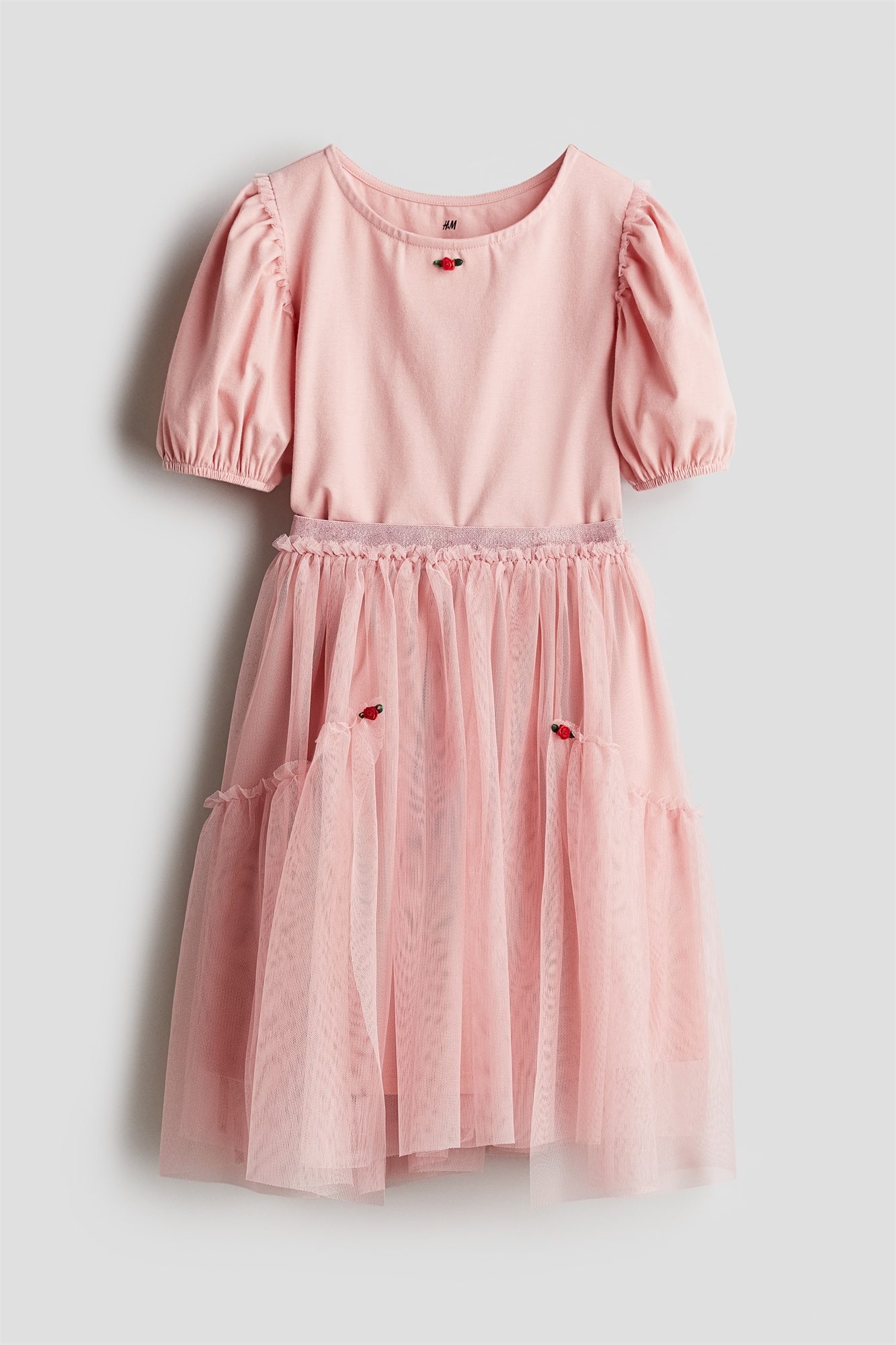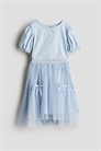 Комплект из топа из хлопкового джерси и юбки из тюля. Топ с круглым вырезом, небольшой аппликацией спереди и короткими пышными рукавами с узкими эластичными манжетами. Блестящая эластичная лента с оборками на талии и расклешенная юбка, украшенная ярусами и маленькими аппликациями. Юбка на подкладке.