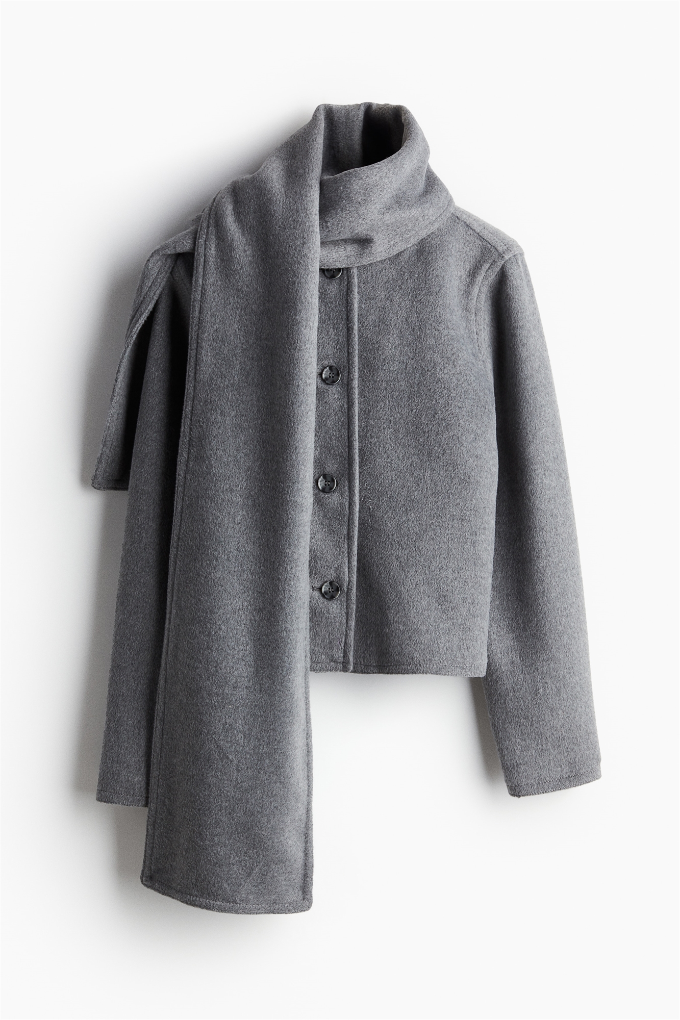 Короткий жакет из мягкой войлочной ткани со съемным шарфом, который застегивается на пуговицы сзади на шее. Круглый вырез, пуговицы спереди и незаметные карманы в боковых швах. Без отделки.
