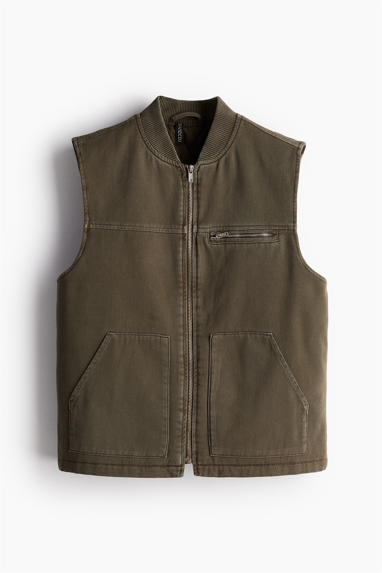 Легкая жилетка из жесткой хлопковой саржи с небольшим ребристым воротником, застежкой на молнию спереди, нагрудным карманом на молнии и накладными передними карманами. На подкладке.