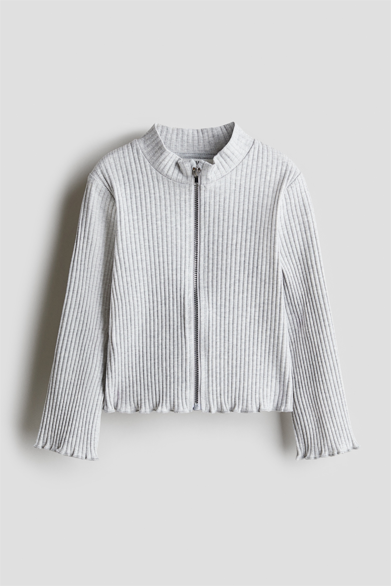 Кардиган из мягкого ребристого хлопкового джерси с воротником-стойкой и застежкой-молнией спереди. Длинные рукава-трубы, манжеты и подол обработаны оверлоком.