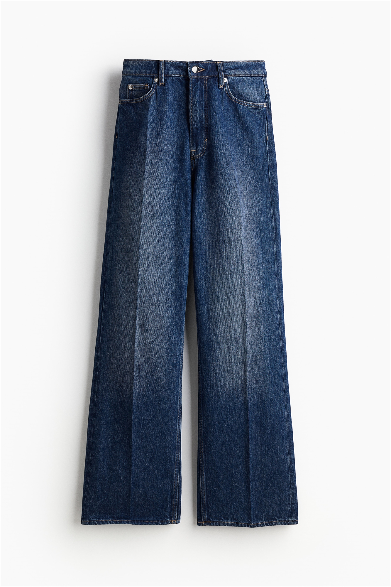 Джинсы с 5 карманами из хлопкового денима с обычной талией, ширинкой на молнии и пуговице и прямыми ногами со складками спереди и сзади.