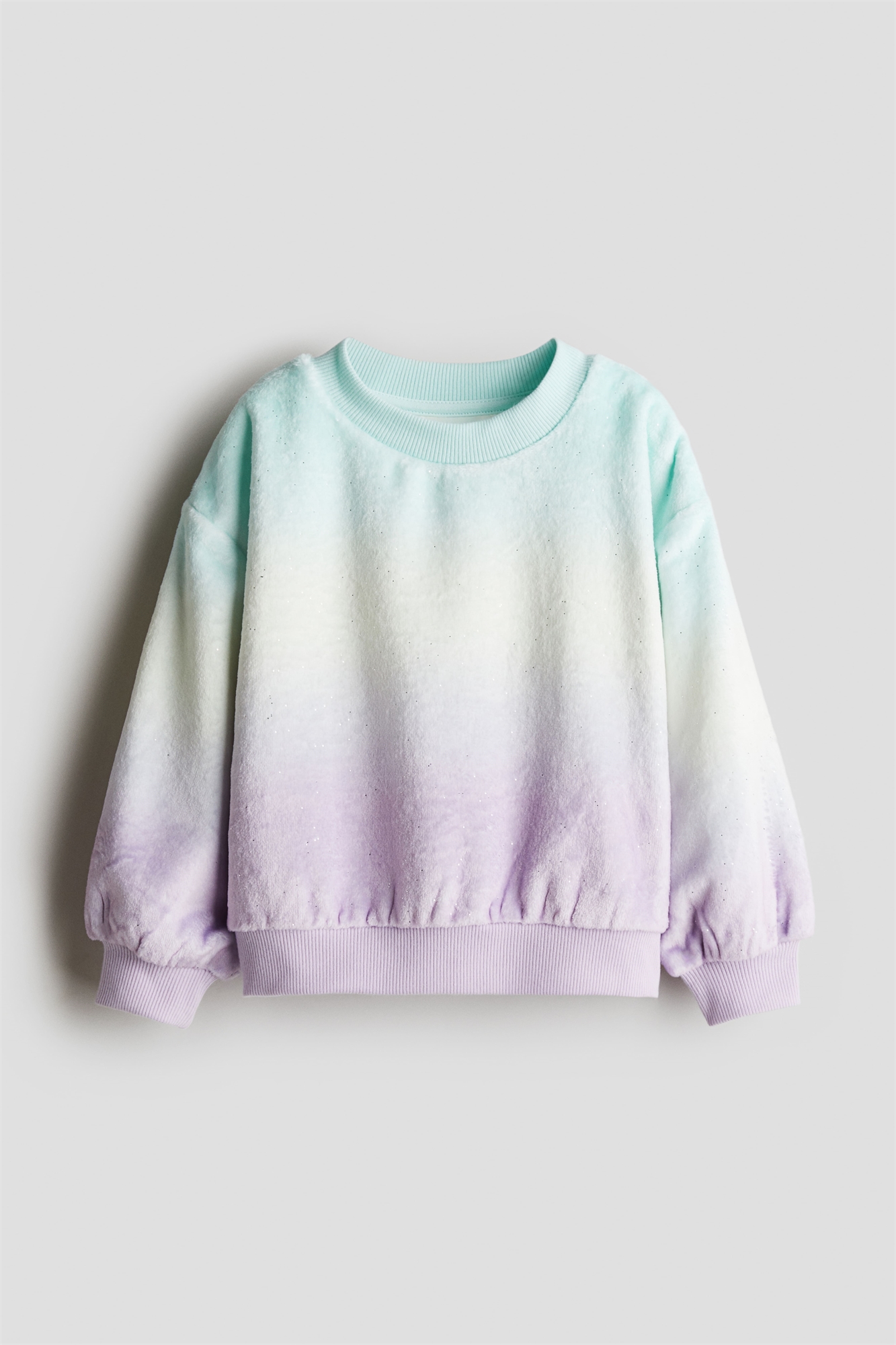 Толстовка из мягкого флиса с круглым вырезом в рубчик, спущенными плечами, манжетами и подолом в рубчик.