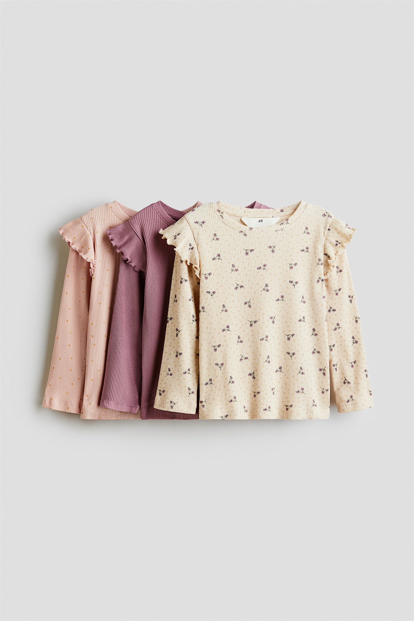 Топы из мягкого, ребристого хлопкового джерси с круглым вырезом, длинными рукавами и отделкой оборкой по плечам.
