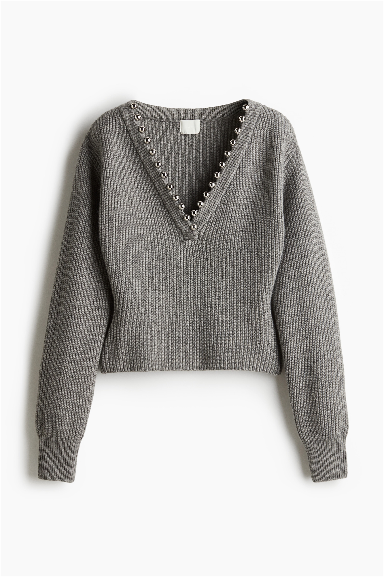 Короткий приталенный джемпер из мягкого трикотажа в рубчик с глубоким V-образным вырезом, украшенным пластиковыми бусинами. Слегка спущенные плечи, длинные рукава с манжетами и зауженная талия.