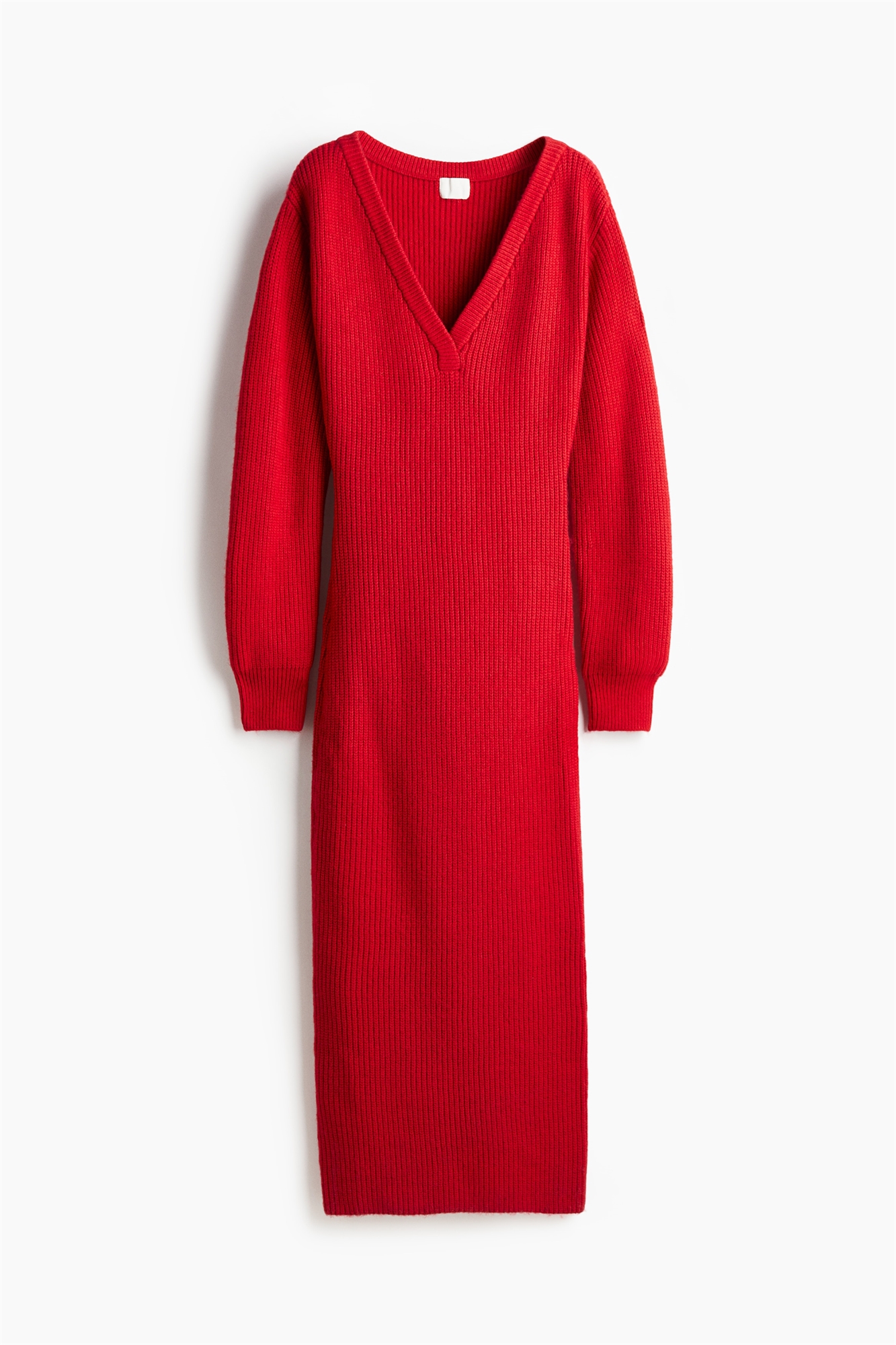 Приталенное платье длиной до колен из мягкого трикотажа в рубчик с глубоким V-образным вырезом, спущенными плечами и длинными рукавами с манжетами.