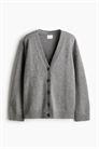 Свободный кардиган из мягкого трикотажа с глубоким V-образным вырезом, застежкой на пуговицы спереди, спущенными плечами и длинными рукавами. Манжеты и подол отделаны резинкой.