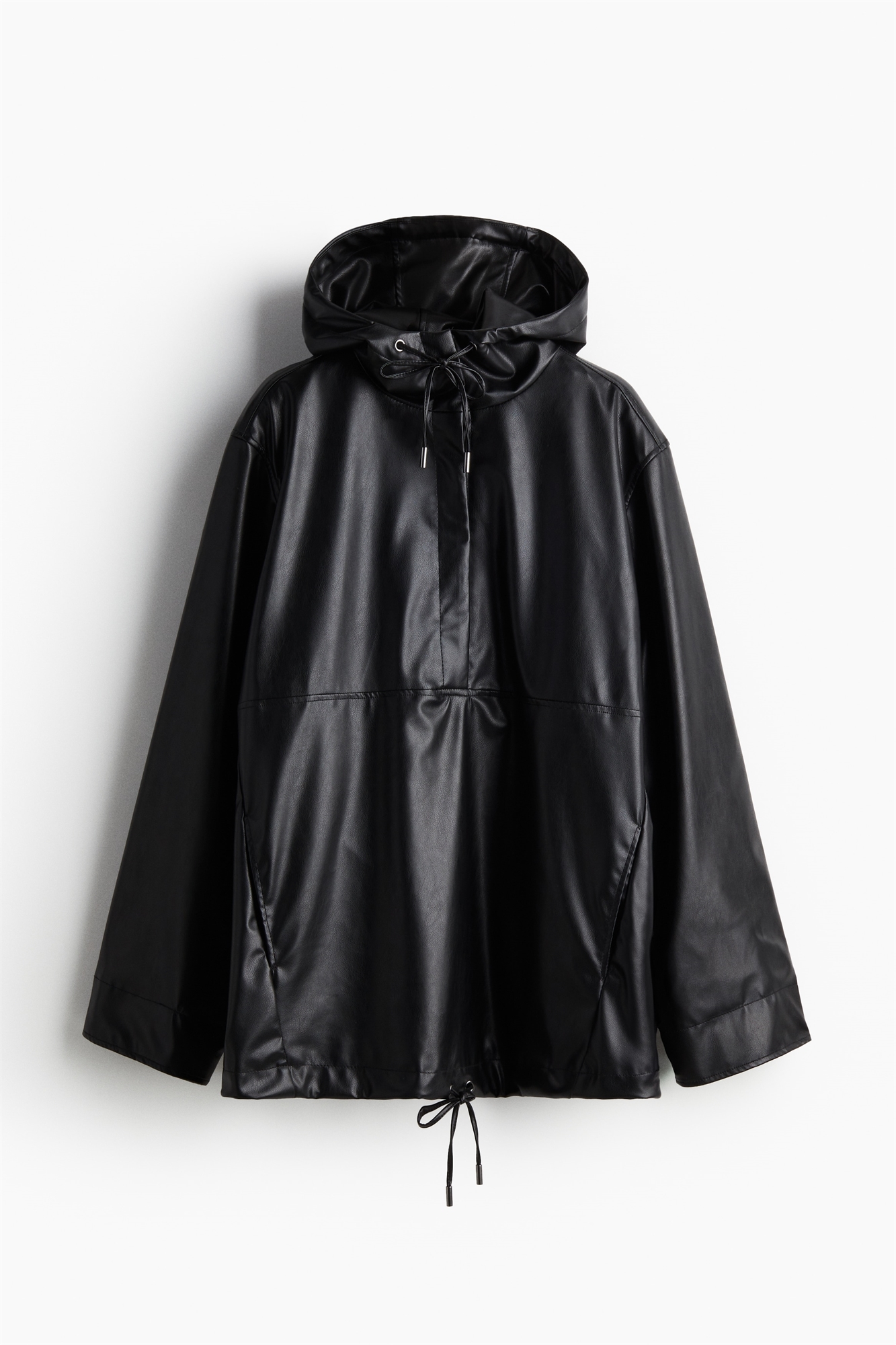 Анорак из лакированной ткани с двухслойным капюшоном на завязках, воротником-стойкой и потайными кнопками в верхней части. Свободный крой с опущенными плечами, длинными рукавами и незаметными боковыми карманами. Стяжка на подоле. На подкладке.